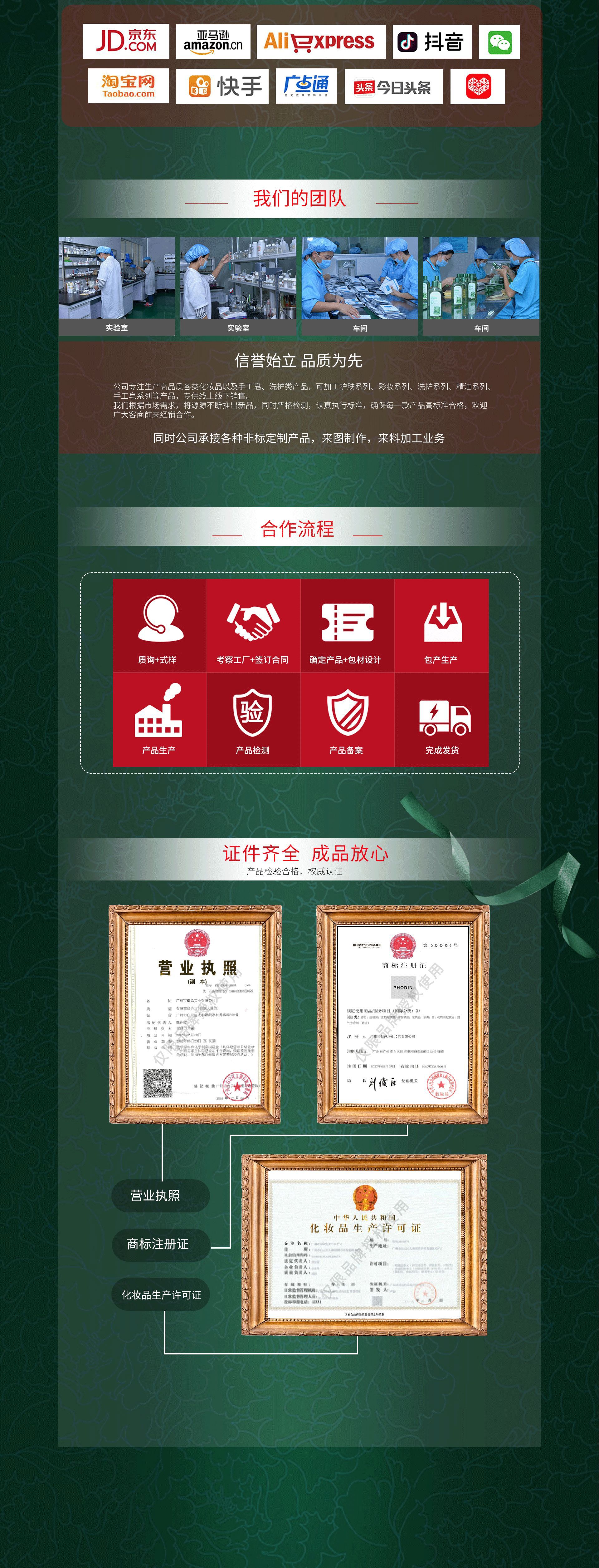 廣州花戀蝶生物科技有限公司是一家經(jīng)國(guó)家相關(guān)部門批準(zhǔn)注冊(cè)的化妝品集團(tuán)企業(yè)。公司在傳統(tǒng)OEM基礎(chǔ)上,專注于為客戶提供ODM、OBM服務(wù)。公司有專業(yè)的研發(fā)與設(shè)計(jì)團(tuán)隊(duì),專業(yè)生產(chǎn)各種美容皂,透明皂,精油皂,手工皂,禮品香皂,廣告香皂,藝術(shù)香皂和純植物油香皂等多樣產(chǎn)品。您不需龐大投資,也不需要耽誤時(shí)間在各個(gè)環(huán)節(jié)的咨詢跟進(jìn)上,公司會(huì)為您定制生產(chǎn)出符合國(guó)際標(biāo)準(zhǔn)的優(yōu)質(zhì)香皂。優(yōu)良的價(jià)格、快速的反應(yīng)、直接的溝通盡顯我們服務(wù)的省心和專業(yè)。 花戀蝶生物科技有限公司推出多套化妝品ODM方案,服務(wù)于沒有太多精力和沒有加工經(jīng)驗(yàn)的客戶,使客戶可以以最短的時(shí)間推出自己的品牌,專注于營(yíng)銷和開拓市場(chǎng),使自己贏利更多,利潤(rùn)最大化。與客戶達(dá)到完美雙贏,是花戀蝶追求的唯一目標(biāo)。 花戀蝶公司廠區(qū)環(huán)境優(yōu)美,廠房面積超過(guò)4000平方米,生產(chǎn)車間環(huán)境完全按照GMP認(rèn)證所需要的條件建設(shè),并一次性通過(guò)“IS09001”質(zhì)量認(rèn)證,其中實(shí)驗(yàn)室、原料室、內(nèi)包材消毒存放間和更衣室均采用十萬(wàn)級(jí)空氣凈化標(biāo)準(zhǔn),其他區(qū)域采用三十萬(wàn)級(jí)空氣凈化標(biāo)準(zhǔn)。 廣州花戀蝶生物科技有限公司憑著良好的信用、優(yōu)良的服務(wù)與多家企業(yè)及供應(yīng)商建立了長(zhǎng)期的合作關(guān)系。熱誠(chéng)歡迎各界朋友前來(lái)參觀、考察、洽談業(yè)務(wù)。