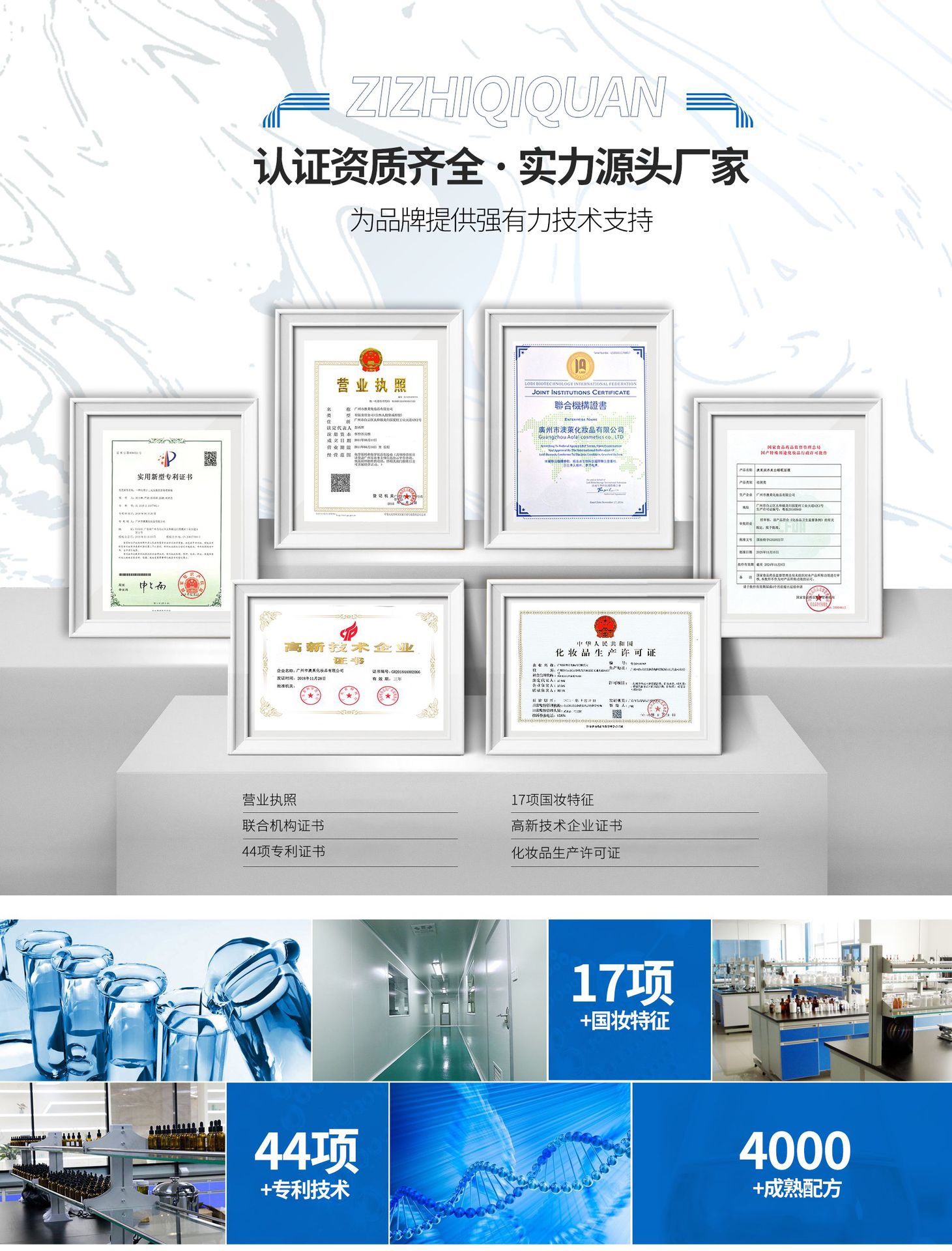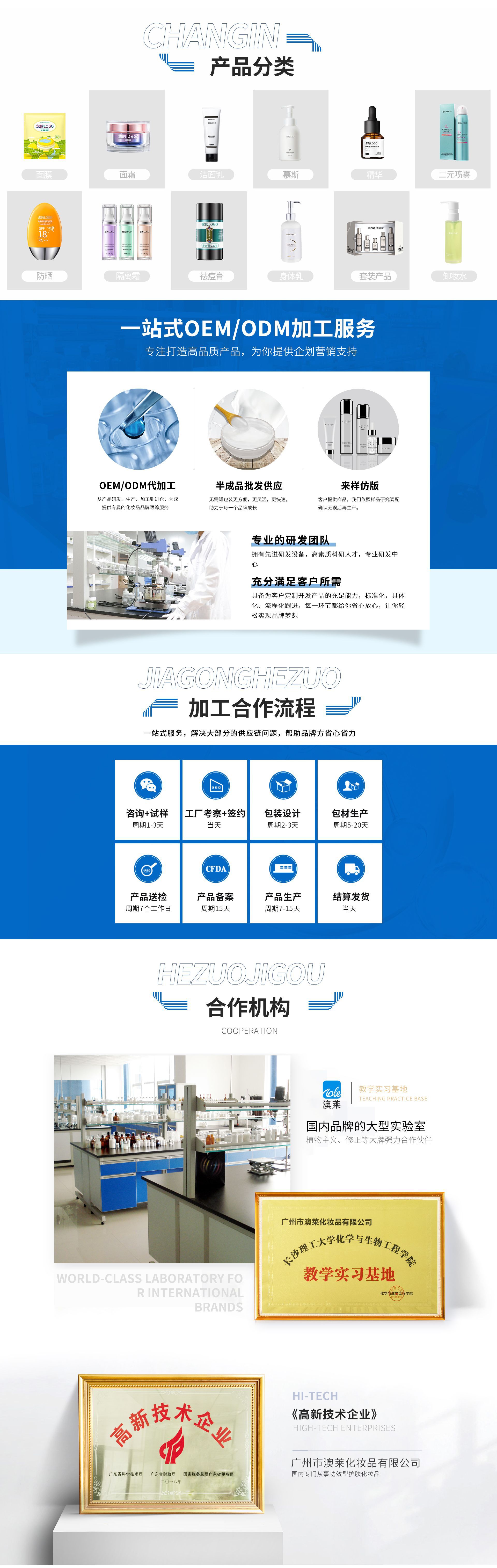 廣州市澳萊化妝品有限公司──專注于護(hù)膚領(lǐng)域的化妝品OEM/ODM專業(yè)制造企業(yè),集產(chǎn)品技術(shù)研發(fā)、加工生產(chǎn)、營(yíng)銷推廣于一體,產(chǎn)品涉及基礎(chǔ)護(hù)膚類、二元噴霧類、美白祛斑類、隔離防曬類、祛痘抗敏修護(hù)類。 軟件方面:已獲得歐盟( ISO22716 )和美國(guó)(GMPC )的雙重認(rèn)證,以及國(guó)家高新技術(shù)企業(yè)證書;并擁有多名資深研發(fā)工程師,開(kāi)發(fā)人員及強(qiáng)大的銷售服務(wù)團(tuán)隊(duì)。累計(jì)沉淀多達(dá)4000多個(gè)成熟配方,52項(xiàng)發(fā)明專利和17個(gè)特證。 硬件方面:工廠擁有12000平方米的GMPC標(biāo)準(zhǔn)生產(chǎn)廠房,以及配套的相關(guān)乳化設(shè)備,二級(jí)反滲透純水裝置,10萬(wàn)級(jí)潔凈生產(chǎn)車間,高效空氣凈化中央空調(diào)系統(tǒng),水劑類、膏霜乳液類、散粉類、洗滌類生產(chǎn)灌裝車間,面貼膜包裝生產(chǎn)線、二元包裝灌裝全自動(dòng)設(shè)備等。按國(guó)家環(huán)保要求安裝一級(jí)污水處理裝置??茖W(xué)的管理及健全規(guī)范的質(zhì)量體系,為客戶提供高品質(zhì)化妝品加工服務(wù)。