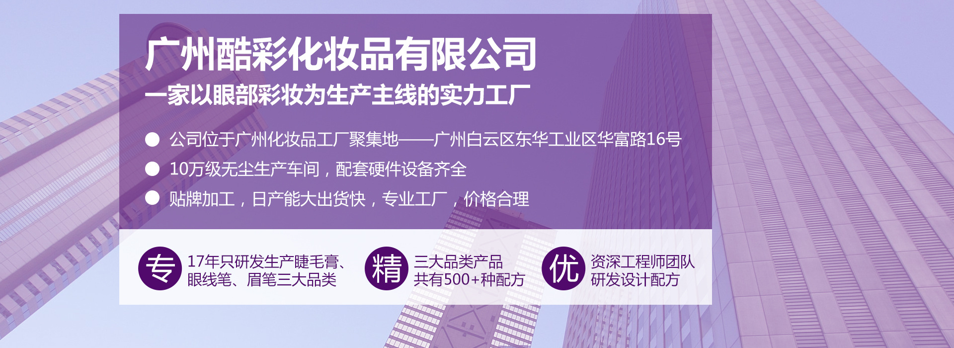 廣州酷彩化妝品有限公司(簡(jiǎn)稱“酷彩”),位于廣州市白云區(qū)人和鎮(zhèn),注冊(cè)資金1000萬(wàn)??岵手鞴ソ廾嗟妊鄄慨a(chǎn)品研發(fā)與生產(chǎn),專注睫毛膏及眼部彩妝產(chǎn)品17年,因?yàn)閷Wⅲ詫I(yè)!目前旗下有員工100-150人,睫毛膏日常量高達(dá)20萬(wàn)支。公司一貫堅(jiān)持“品質(zhì)為本,服務(wù)為根,信守合同,合作無(wú)憂”的宗旨,多年如一日的服務(wù)客戶,客戶覆蓋全國(guó)三十余省市,產(chǎn)品進(jìn)出口東南亞、中東等國(guó)家與海外地區(qū),竭誠(chéng)與國(guó)內(nèi)外商家雙贏合作,一同發(fā)展,共創(chuàng)輝煌!