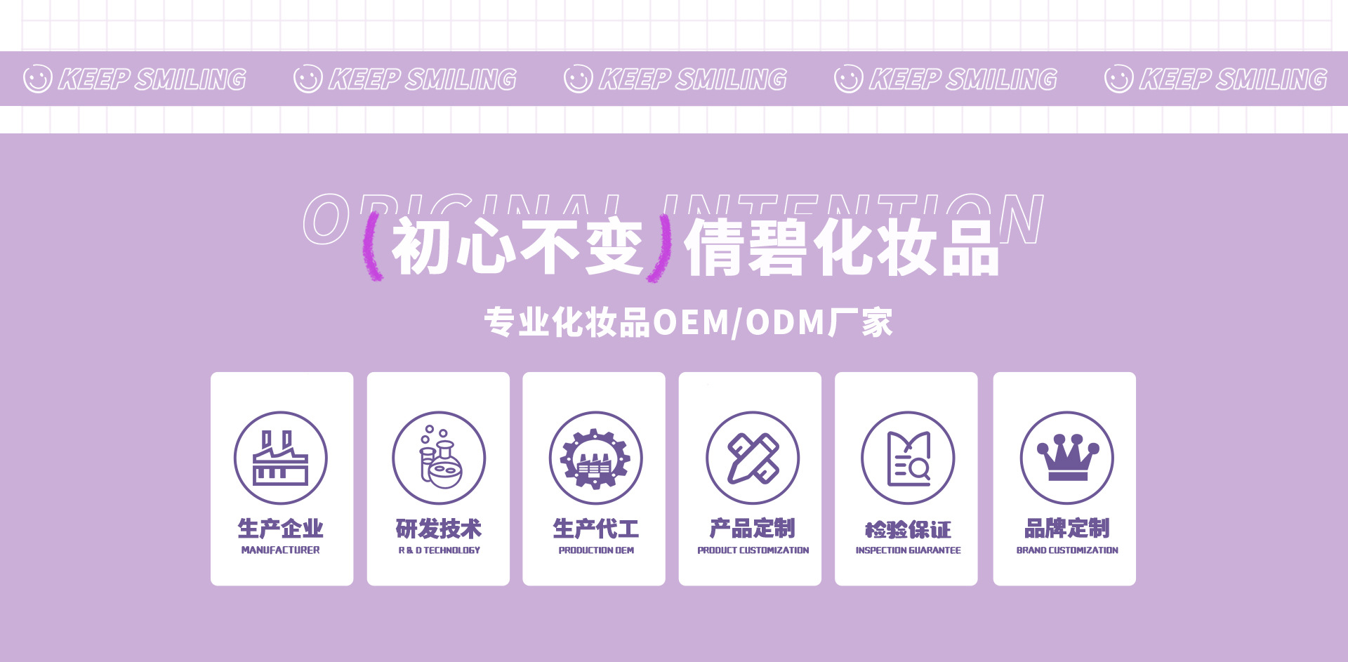 廣州市倩碧化妝品有限公司隸屬尚莊集團(tuán),是集研發(fā)、設(shè)計(jì)、生產(chǎn)銷售于一體,專業(yè)化妝品OEM/ODM加工企業(yè),幫助客戶在日化線、專業(yè)線 打造一個(gè)高品質(zhì)、豐富品系的品牌,公司基地位于花都區(qū)新雅街東輝路2號,占地面積30000平方米,工廠嚴(yán)格按照GMP生 產(chǎn)標(biāo)準(zhǔn)建設(shè),參照美聯(lián)邦標(biāo)準(zhǔn)FS209E以及日本JIS(9920-1989)標(biāo)準(zhǔn)進(jìn)行設(shè)計(jì)建造,公司以彩妝各品類化妝品(彩妝全品類、 底妝品類、卸妝品類、護(hù)膚品類)為主,產(chǎn)品行銷全國各地,遠(yuǎn)銷日本,韓國,歐洲等國,在全國各地已經(jīng)建立了非常完 善的銷售網(wǎng)絡(luò)渠道,擁有全國各地省,市級代理商,公司憑借優(yōu)質(zhì)的產(chǎn)品和優(yōu)質(zhì)的服務(wù)贏得了良好的市場聲譽(yù),在行業(yè)內(nèi) 建立了一定的知名度!是集產(chǎn)品研發(fā),生產(chǎn),包裝配套,品牌推廣,市場營銷于一體的完整供應(yīng)鏈公司