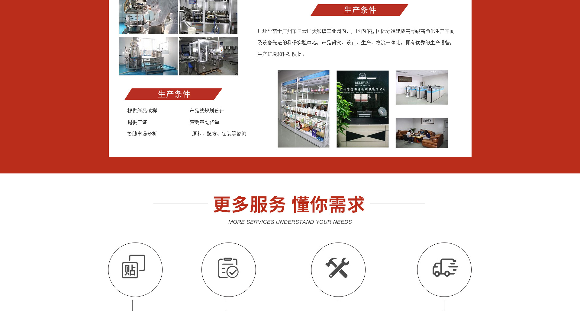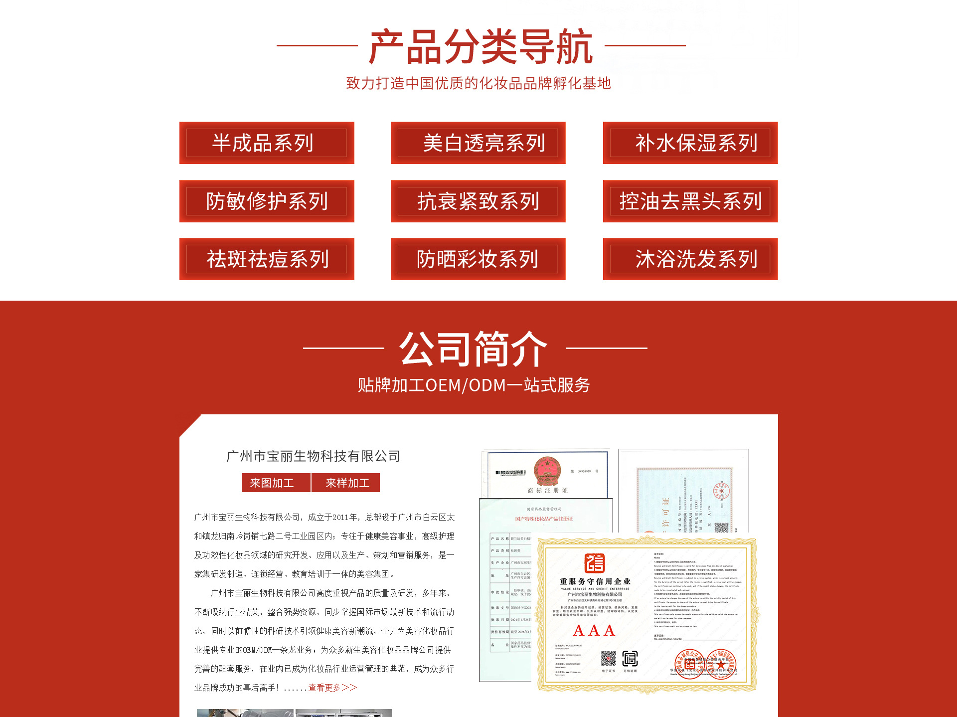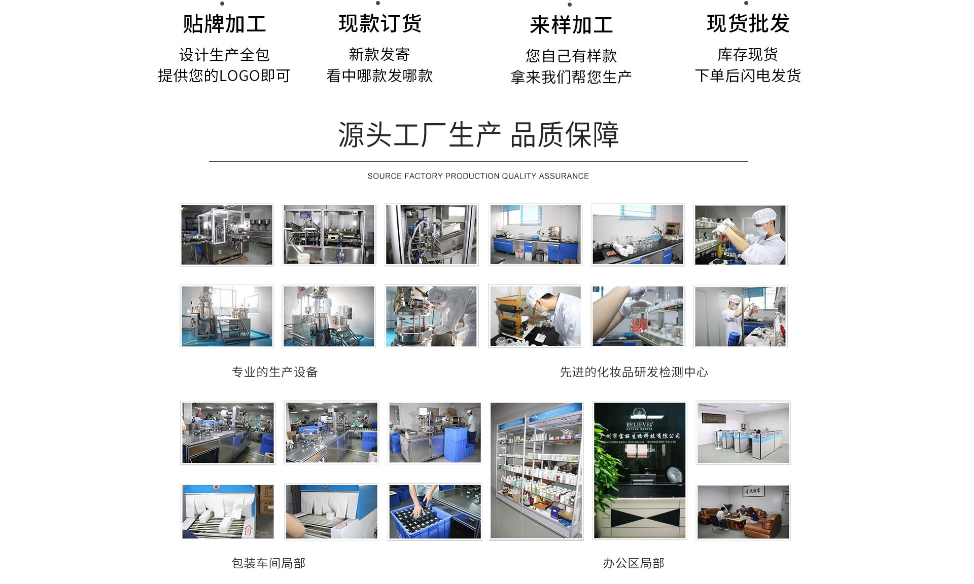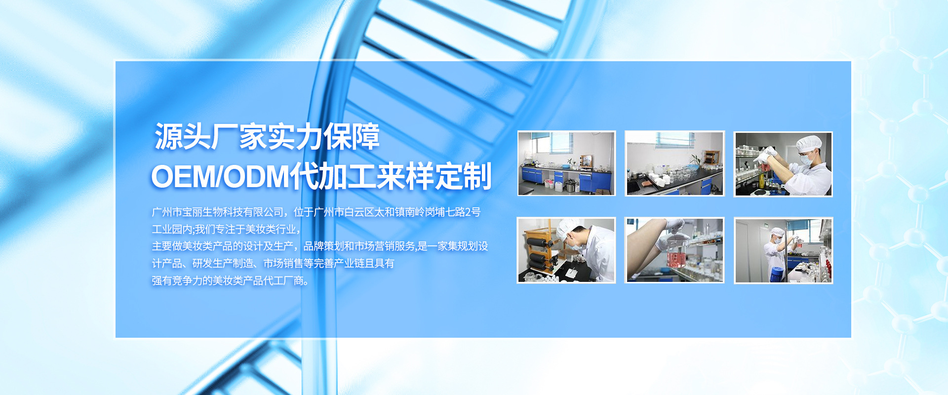 廣州市寶麗生物科技有限公司,成立于2011年,總部設(shè)于廣州市白云區(qū)太和鎮(zhèn)龍歸南嶺崗鋪七路二號工業(yè)園區(qū)內(nèi);專注于健康美容事業(yè),高級護(hù)理及功效性化妝品領(lǐng)域的研究開發(fā)、應(yīng)用以及生產(chǎn)、策劃和營銷服務(wù),是一家集研發(fā)制造、連鎖經(jīng)營、教育培訓(xùn)于一體的美容集團(tuán)。 廣州市寶麗生物科技有限公司高度重視產(chǎn)品的質(zhì)量及研發(fā),多年來,不斷吸納行業(yè)精英,整合強(qiáng)勢資源,同步掌握國際市場最新技術(shù)和流行動態(tài),同時以前瞻性的科研技術(shù)引領(lǐng)健康美容新潮流,全力為美容化妝品行業(yè)提供專業(yè)的OEM/ODM一條龍業(yè)務(wù);為眾多新生美容化妝品品牌公司提供完善的配套服務(wù),在業(yè)內(nèi)已成為化妝品行業(yè)運營管理的典范,成為眾多行業(yè)品牌成功的幕后高手! 2013年,廣州市寶麗生物科技有限公司投入巨資建成了標(biāo)準(zhǔn)式的化妝品廠房,并特聘行業(yè)資深管理及技術(shù)人員負(fù)責(zé)運作,生產(chǎn)基地?fù)碛协h(huán)保舒適的現(xiàn)代化生產(chǎn)車間
