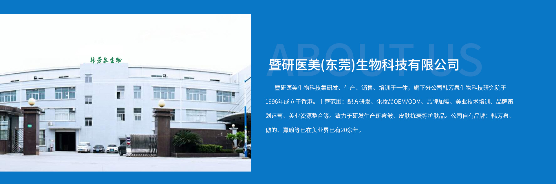 暨研醫(yī)美生物科技集研發(fā)、生產(chǎn)、銷售、培訓(xùn)于一體,旗下分公司韓芳泉生物科技研究院于1996年成立于香港。主營(yíng)范圍:配方研發(fā)、化妝品OEM/ODM、品牌加盟、美業(yè)技術(shù)培訓(xùn)、品牌策劃運(yùn)營(yíng)、美業(yè)資源整合等。致力于研發(fā)生產(chǎn)斑痘皺、皮膚抗衰等高端護(hù)膚品,打造比醫(yī)療美容更安全,比生活美容更有效的“便攜式口袋美容院”。公司自有品牌:韓芳泉、傲的、熹瑜等已在美業(yè)界已有20余年的知名度。