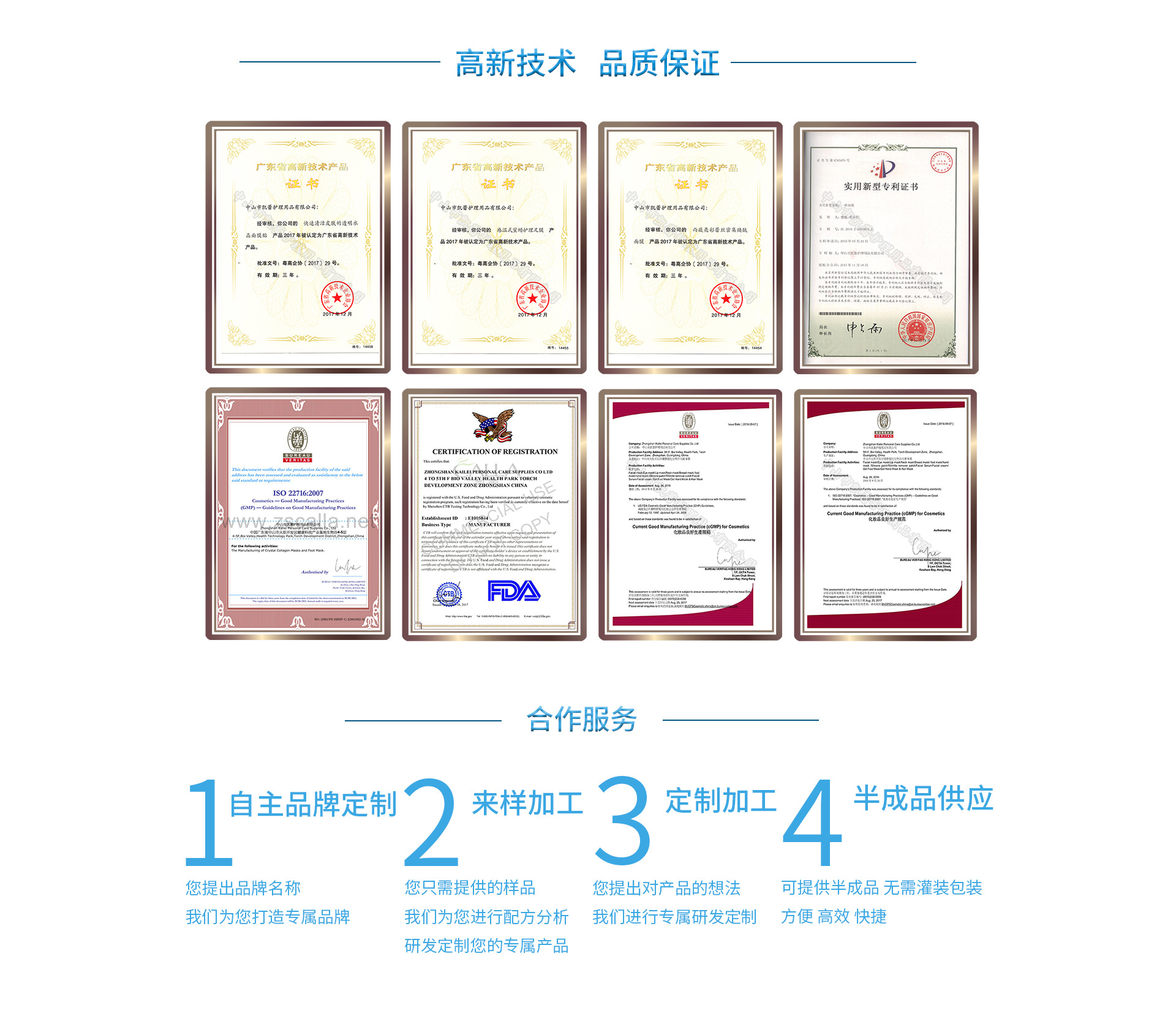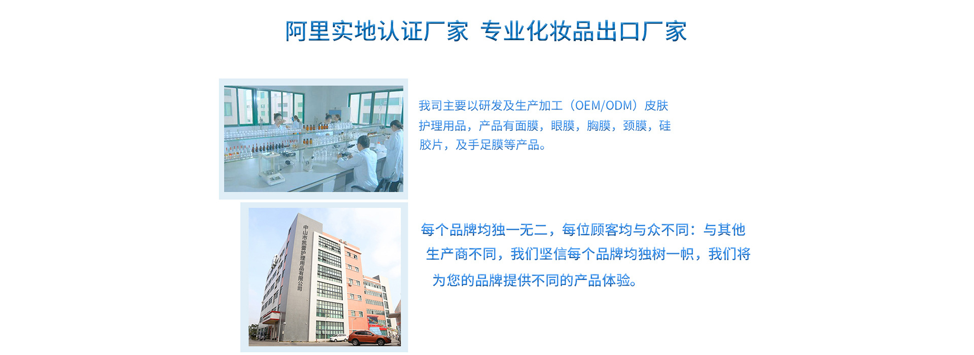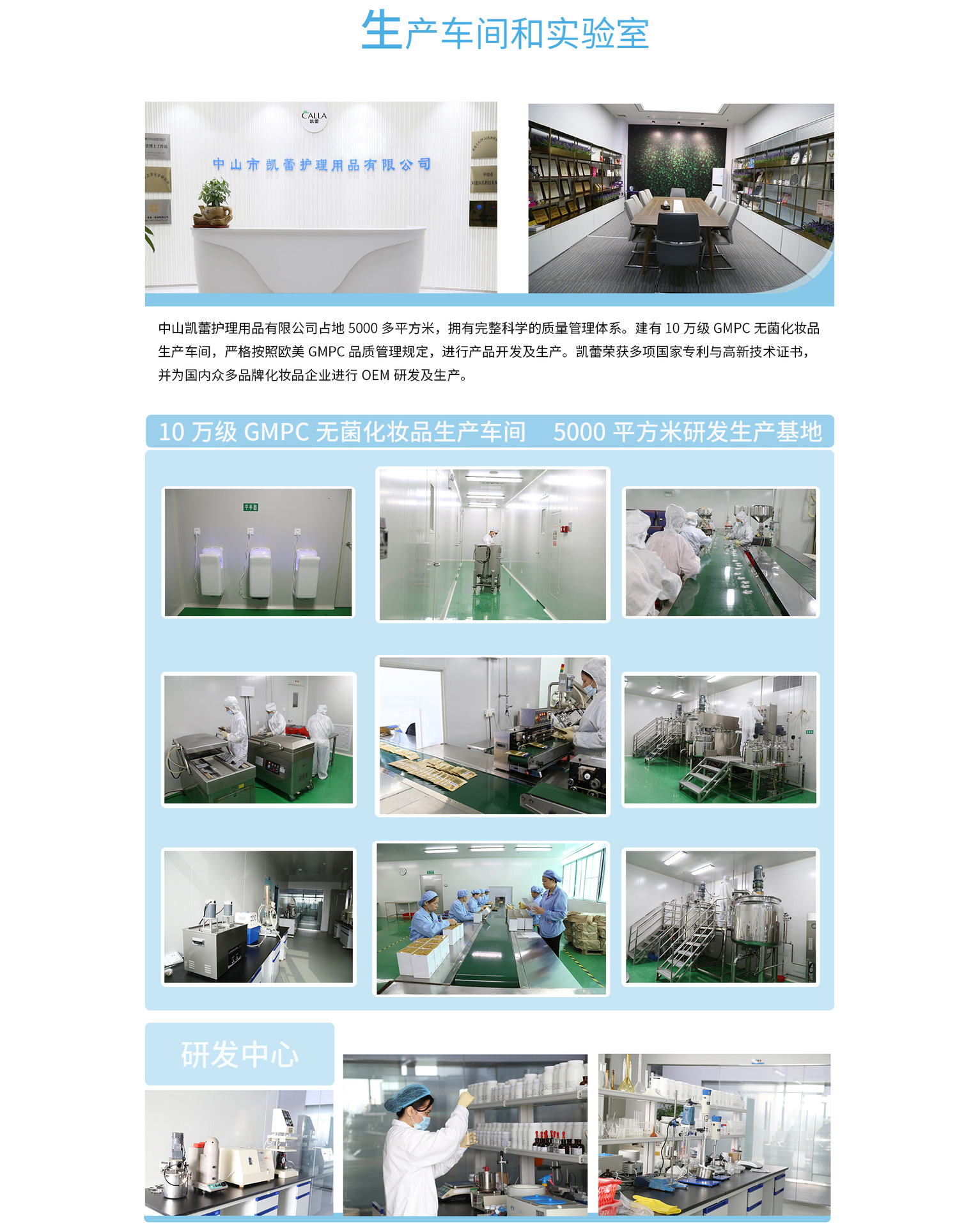 中山市凱蕾護(hù)理用品有限公司成立于2007年,位于南朗鎮(zhèn)華南現(xiàn)代中醫(yī)藥城,是一家致力于護(hù)膚、消毒,防護(hù)、創(chuàng)傷病變護(hù)理用品研發(fā)與生產(chǎn)的科技型企業(yè)。同時(shí)也是惠譽(yù)生物醫(yī)學(xué)研究院博士工作站、中山市應(yīng)用化學(xué)研究所及再生醫(yī)學(xué)轉(zhuǎn)化研究中心的定點(diǎn)合作單位,于2017年被評(píng)定為廣東省高新技術(shù)企業(yè)。在雄厚的科研團(tuán)隊(duì)帶領(lǐng)下,我們擁有多項(xiàng)專利,這十幾年來與國、內(nèi)外眾多知名品牌進(jìn)行了深入的OEM/ODM品牌代工合作。 為擴(kuò)大產(chǎn)能,2018年從德國購置先進(jìn)的生產(chǎn)設(shè)備,引進(jìn)韓國技術(shù),打造十萬級(jí)GMP無塵生產(chǎn)車間,同時(shí)也通過了化妝品行業(yè)的國際標(biāo)準(zhǔn)ISO 22716管理體系,擁有BSCI、美國FDA、GMPC、CPSR、SGS等國際認(rèn)證 。