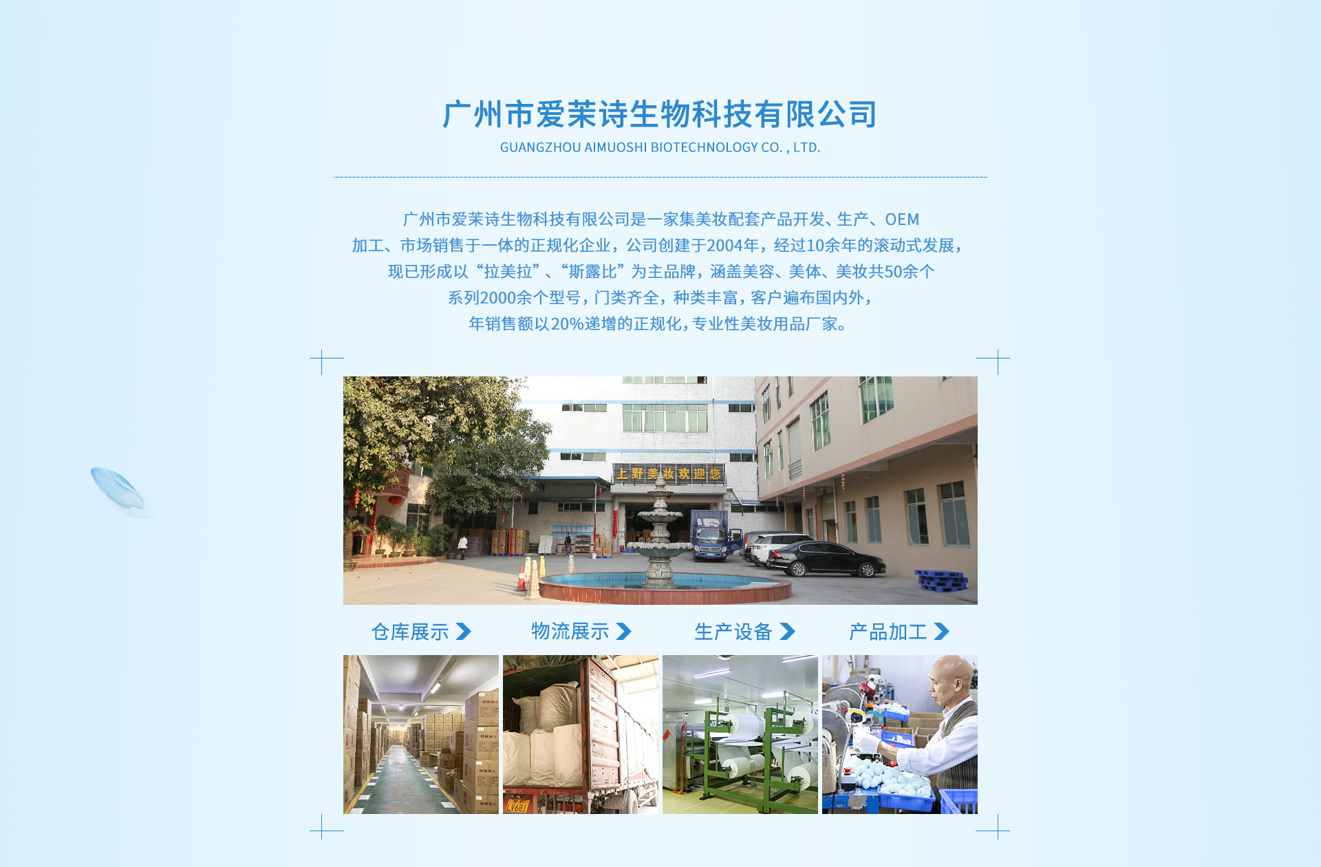 廣州愛(ài)茉詩(shī)生物科技有限公司是一家集美妝配套產(chǎn)品開(kāi)發(fā)、生產(chǎn)、OEM加工、市場(chǎng)銷售于一體的正規(guī)化企業(yè),其前身為廣州市白云區(qū)佐格勞蘭化妝用具廠。公司創(chuàng)建于2004年,經(jīng)過(guò)10余年的滾動(dòng)式發(fā)展,現(xiàn)已形成以“斯露比”、“拉美拉”為主品牌,涵蓋美容、美體、美妝共50余個(gè)系列2000余個(gè)型號(hào),門類齊全,種類豐富,客戶遍布國(guó)內(nèi)外,年銷售額以20%遞增的正規(guī)化,專業(yè)性美妝用品廠家。