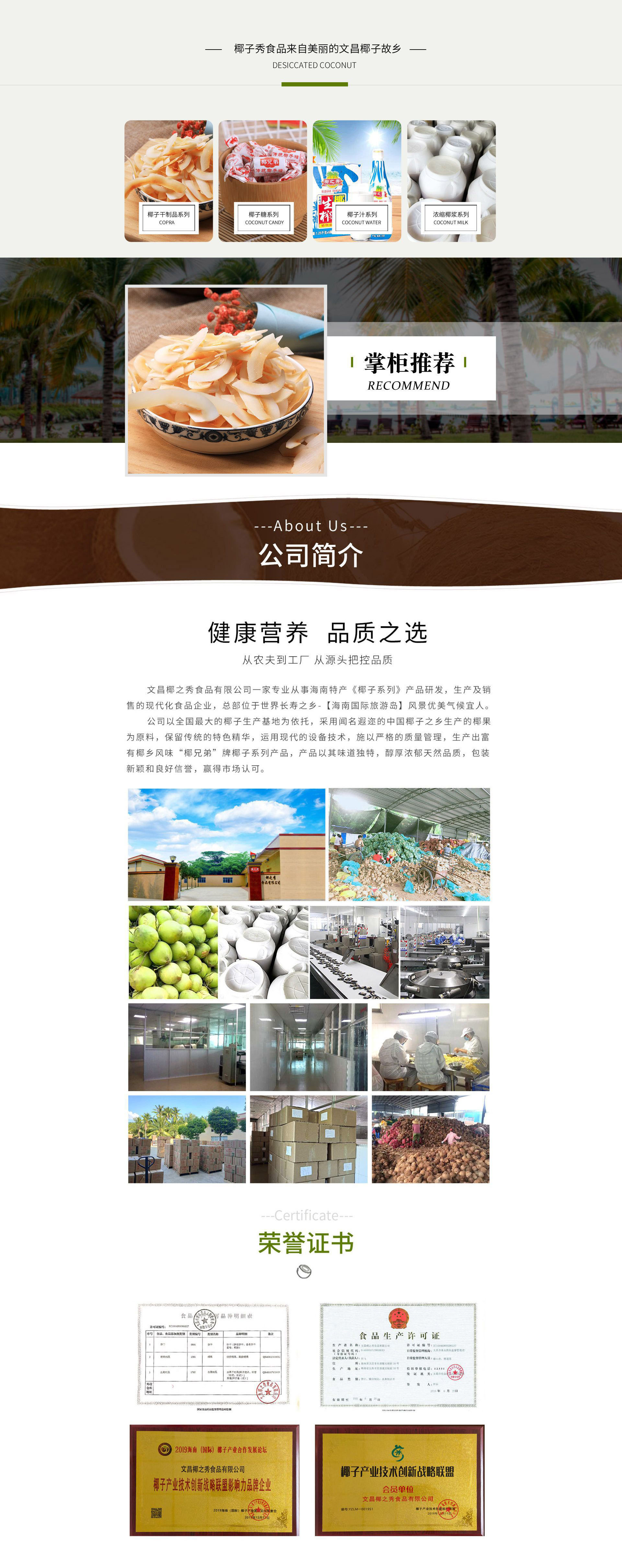 文昌椰之秀食品有限公司是致力于將純天然.無添加的椰子干系列產(chǎn)品帶到您生活方方面面的一家企業(yè)。也是海南最早研發(fā)生產(chǎn)椰子干廠家,椰子干系列產(chǎn)品廣銷海內(nèi)外,是全國(guó)最大的椰子片供應(yīng)商。因?yàn)閷W⑺詫I(yè),建廠20年的行業(yè)經(jīng)驗(yàn)讓我們熟練掌握椰子干烘培工藝,并且做到精細(xì)化、高質(zhì)量、高產(chǎn)能品質(zhì)保障。從原料是海南原產(chǎn)地直采到完善的流水線生產(chǎn),以確保產(chǎn)品最佳品質(zhì)及原有風(fēng)味,提供質(zhì)量證書、檢測(cè)報(bào)告,保證每天產(chǎn)能15噸以上,一直在業(yè)內(nèi)廣受好評(píng)。公司主營(yíng)產(chǎn)品三大系列:椰子干制品系列,香脆椰子片、無糖椰子片、黃金烤椰片、黃金椰粒、香烤椰粒、無糖烤椰粒、黃金椰子塊、香脆椰子塊為主導(dǎo)。椰子糖系列:傳統(tǒng)椰子糖、特制椰子糖、特濃椰子糖、椰子糕、含留香椰子糖,濃縮椰漿。椰子汁系列:鮮榨椰子汁、濃縮椰子汁。貨源充足穩(wěn)定,原料優(yōu)質(zhì),品質(zhì)上乘。公司以“誠(chéng)信興商,確保質(zhì)量安全”為經(jīng)營(yíng)宗旨。