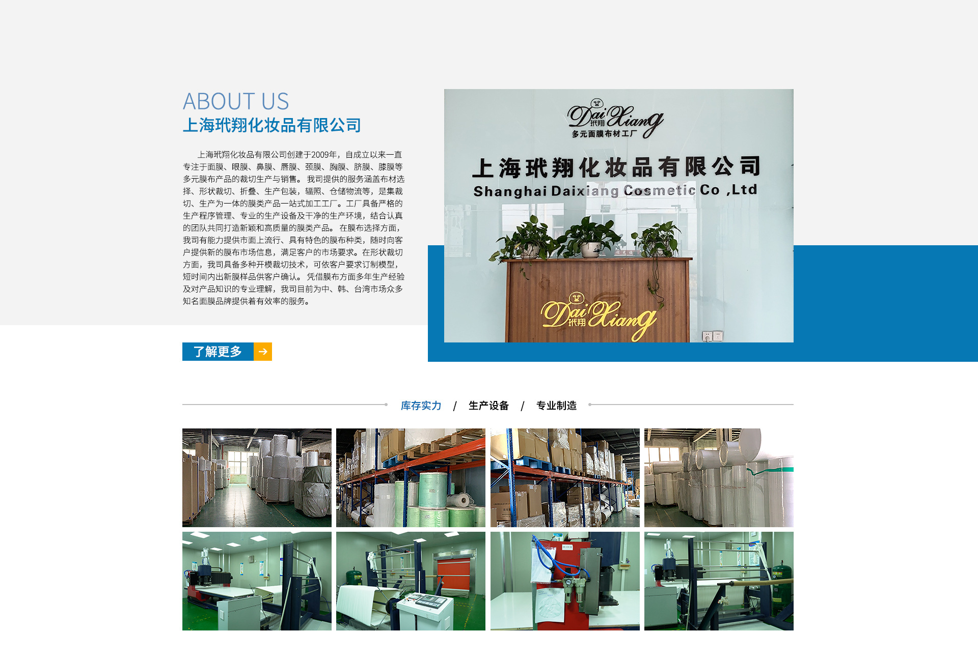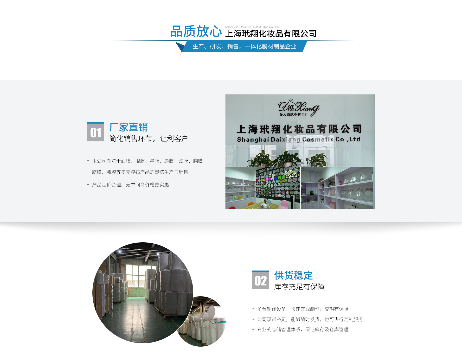 上海玳翔化妝品有限公司,創(chuàng)建于2009年,自成立以來一直專注于面膜、眼膜、鼻膜、唇膜、頸膜、胸膜、臍膜、膝膜等多元膜布產(chǎn)品的裁切生產(chǎn)與貿(mào)易。 我司提供的服務(wù)范圍涵蓋布材選擇、形狀裁切、折疊、生產(chǎn)包裝,輻照、倉(cāng)儲(chǔ)物流等,是集裁切、生產(chǎn)于一體的膜類產(chǎn)品一站式加工工廠。工廠具備嚴(yán)格的生產(chǎn)管理程序、先進(jìn)的生產(chǎn)設(shè)備及一流的生產(chǎn)環(huán)境,結(jié)合高效的團(tuán)隊(duì)共同打造新穎和高質(zhì)量的膜類產(chǎn)品。 我司與多家知名化妝品公司建立了長(zhǎng)期穩(wěn)定的合作關(guān)系,膜布品種齊全、款式新穎、價(jià)格合理,企業(yè)實(shí)力雄厚,重信用、守合同、保證產(chǎn)品質(zhì)量,以多品種經(jīng)營(yíng)特色和薄利多銷的原則,贏得了廣大客戶的信任,公司始終奉行“誠(chéng)信求實(shí)、致力服務(wù)、唯求滿意”的企業(yè)宗旨,為客戶實(shí)時(shí)提供市面上最為流行、獨(dú)具特色的膜布種類,以期用更好的產(chǎn)品回報(bào)每一位客戶,將美麗事業(yè)進(jìn)行到底! 今后,膜材引領(lǐng)面膜成品、玳翔引領(lǐng)膜材產(chǎn)品將繼續(xù)成為我司不斷努力的方向。