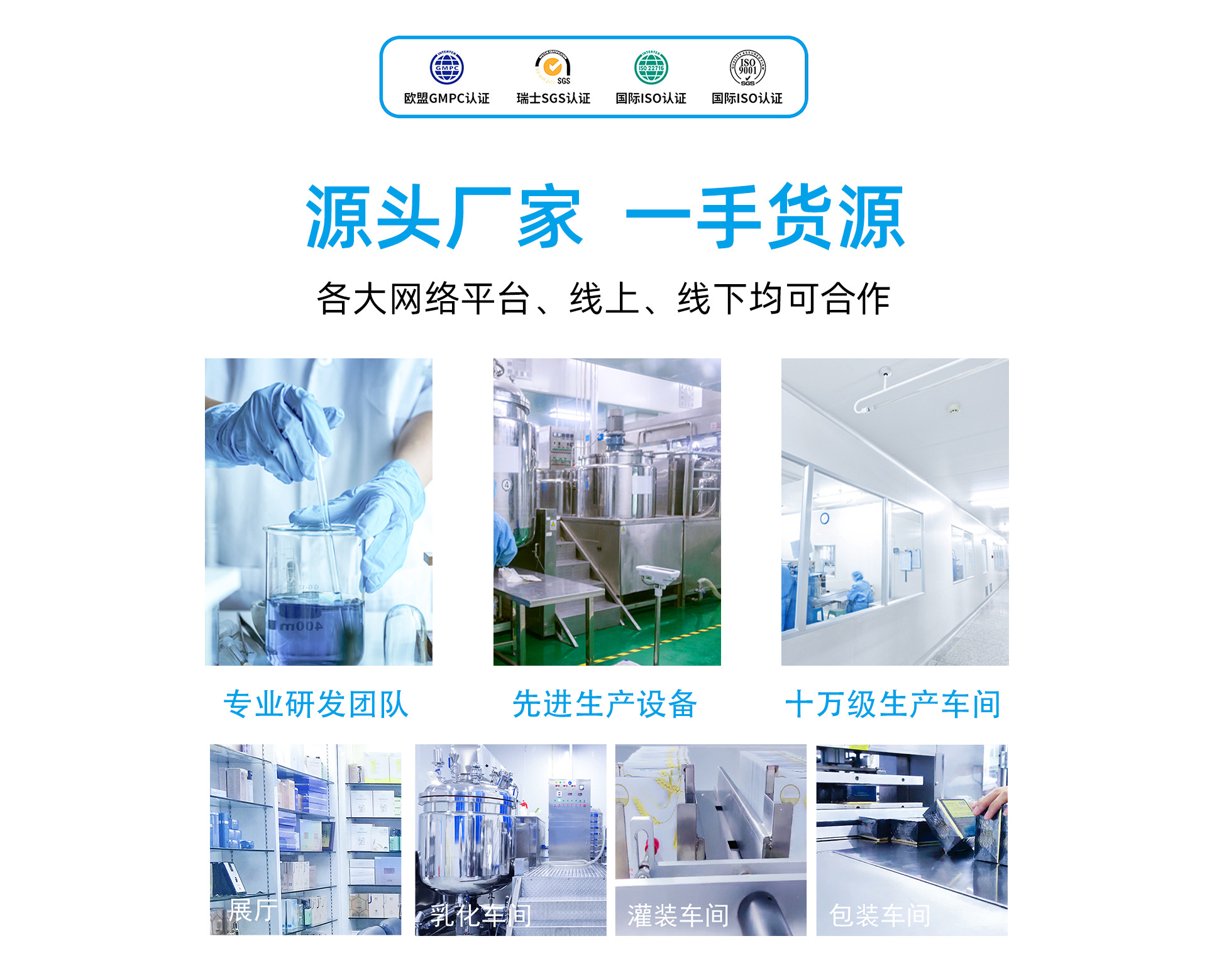 廣州邦婷化妝品有限公司創(chuàng)立于2014年,是一家專業(yè)的OEM/ODM一站式化妝品生產(chǎn)服務(wù)機(jī)構(gòu)。公司始終堅(jiān)持“品質(zhì)第一,服務(wù)至上”的原則,秉承“草本萃取,天然護(hù)膚”的健康理念,經(jīng)過六年的創(chuàng)新與發(fā)展,現(xiàn)已成長(zhǎng)為中國(guó)著名化妝品企業(yè),目前公司產(chǎn)品已遍及全國(guó)各地,得到了眾多合作商與消費(fèi)者的廣泛認(rèn)可。 公司資質(zhì)齊全,免費(fèi)為客戶提供商標(biāo)注冊(cè)、產(chǎn)品設(shè)計(jì)、產(chǎn)品備案、一件代發(fā)等服務(wù),十萬(wàn)級(jí)的無塵生產(chǎn)車間為您的產(chǎn)品品質(zhì)保駕護(hù)航。 公司可代工的品類有:面膜、眼膜、水乳套裝、清潔卸妝、鼻貼、面霜、眼霜、手霜、精華液、原液、洗手液、洗發(fā)水、沐浴露、祛斑產(chǎn)品、豐胸產(chǎn)品、減肥產(chǎn)品、脫毛產(chǎn)品等等各類清潔洗護(hù)化妝品。 產(chǎn)品功效涵蓋:補(bǔ)水保濕、舒緩修復(fù)、控油祛痘、美白祛斑、緊致嫩膚、淡化細(xì)紋、收縮毛孔、去黑頭、抗氧化、抗衰老等。