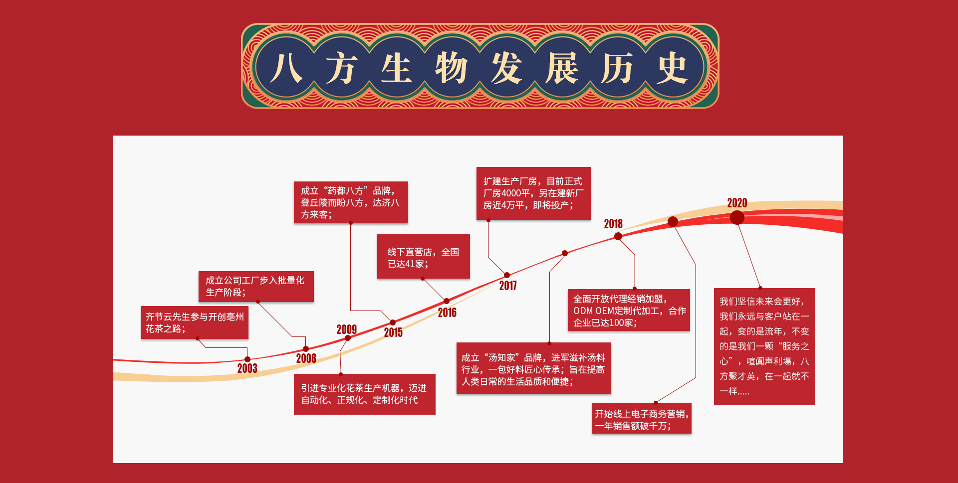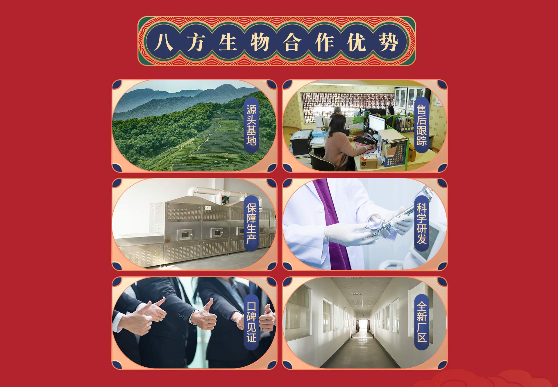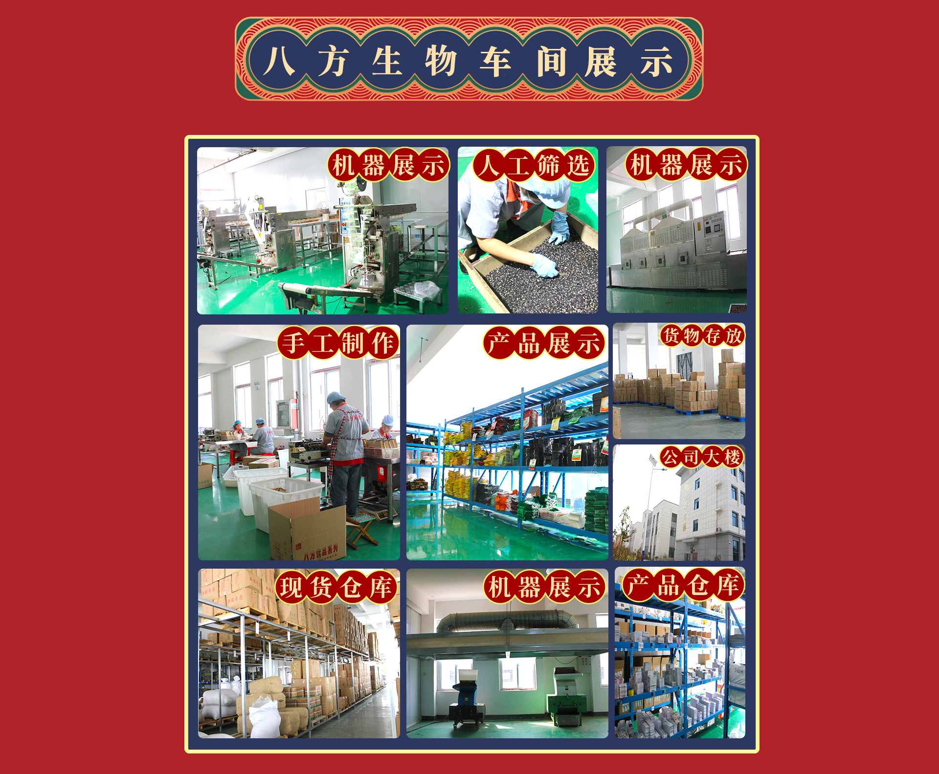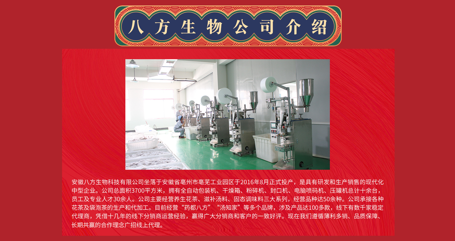 安徽八方生物科技有限公司成立于2016年5月,注冊(cè)資本2000萬(wàn)元。公司坐落于安徽省亳州市亳蕪現(xiàn)代產(chǎn)業(yè)園區(qū)??偨ㄖ娣e3700平方米。是一家集“資源、人才、技術(shù)、管理”于一體的專業(yè)從事代用茶、調(diào)味料的研發(fā)和生產(chǎn)銷售的現(xiàn)代化中小型企業(yè)。公司現(xiàn)有員工30多人,其中,具有大中專畢業(yè)學(xué)歷人員達(dá)40%以上。 我公司于2016年8月正式投產(chǎn),公司擁有全自動(dòng)包裝流水線等先進(jìn)的生產(chǎn)設(shè)備,能夠滿足市場(chǎng)大部分花茶等產(chǎn)品的包裝規(guī)格和客戶需求。產(chǎn)品有養(yǎng)生花茶、滋補(bǔ)湯料、固態(tài)調(diào)味料三大系列,共50多個(gè)品種,產(chǎn)品在同行業(yè)及國(guó)內(nèi)市場(chǎng)都享有較高聲譽(yù)。同時(shí),公司還承接各種花茶及袋泡茶的生產(chǎn)和代加工。我公司秉承“質(zhì)量為本,勇于創(chuàng)新”的發(fā)展理念,依托地域優(yōu)勢(shì),堅(jiān)持優(yōu)質(zhì)原料購(gòu)進(jìn),手工精挑細(xì)選,科學(xué)配比加工。