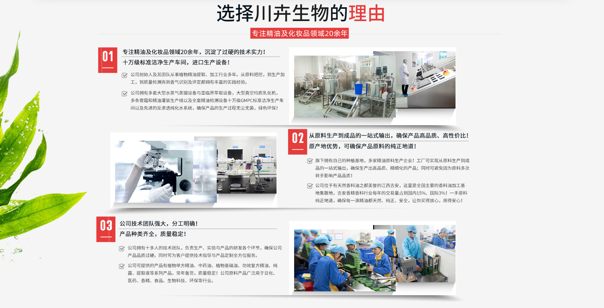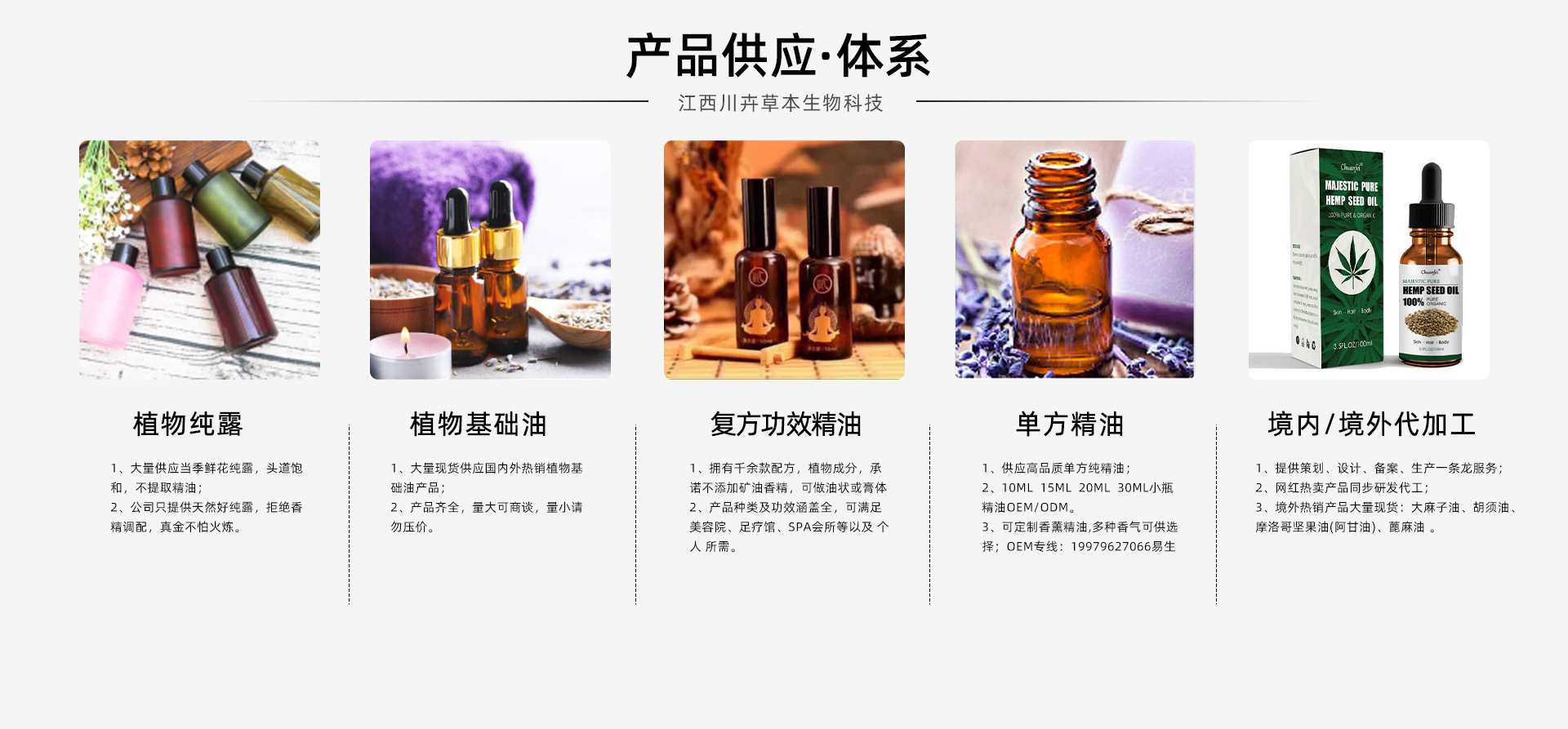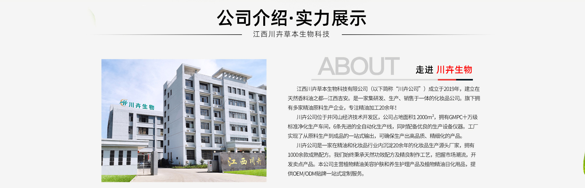江西川卉草本生物科技有限公司(以下簡(jiǎn)稱“川卉公司”)成立于2019年,建立在天然香料油之都—江西吉安。是一家集研發(fā)、生產(chǎn)、銷售于一體的化妝品公司。旗下?lián)碛卸嗉揖驮仙a(chǎn)企業(yè),專注精油加工20余年! 川卉公司位于國(guó)家級(jí)井岡山經(jīng)濟(jì)技術(shù)開發(fā)區(qū),公司占地面積1 2000m2,擁有GMPC十萬(wàn)級(jí)標(biāo)準(zhǔn)凈化生產(chǎn)車間,6條先進(jìn)的全自動(dòng)化生產(chǎn)線,同時(shí)配備先進(jìn)的生產(chǎn)設(shè)備儀器。工廠實(shí)現(xiàn)了從原料生產(chǎn)到成品的一站式輸出,可確保生產(chǎn)出高品質(zhì)、精細(xì)化的產(chǎn)品。 川卉公司是一家在精油和化妝品行業(yè)內(nèi)沉淀20余年的化妝品生產(chǎn)源頭廠家,擁有1000余款成熟配方。我們始終秉承天然功效配方及精良制作工藝,把握市場(chǎng)潮流,開發(fā)賣點(diǎn)產(chǎn)品。本公司主營(yíng)植物精油美容護(hù)膚和養(yǎng)生護(hù)理產(chǎn)品及植物精油日化用品,提供OEM/ODM貼牌加工一站式定制服務(wù)。