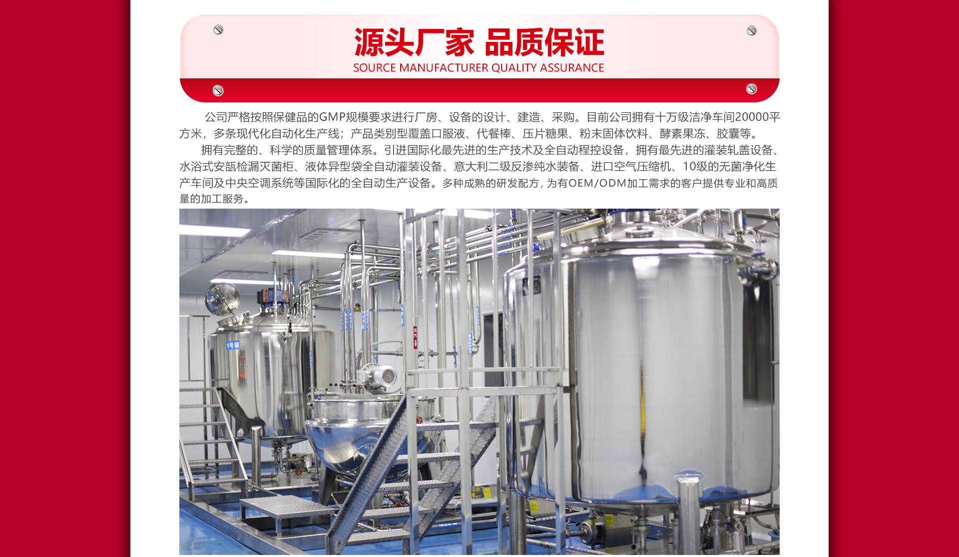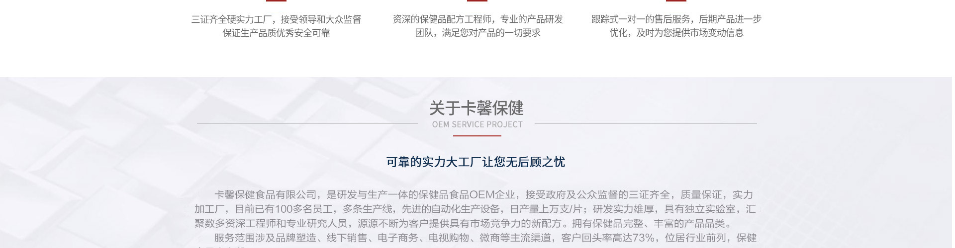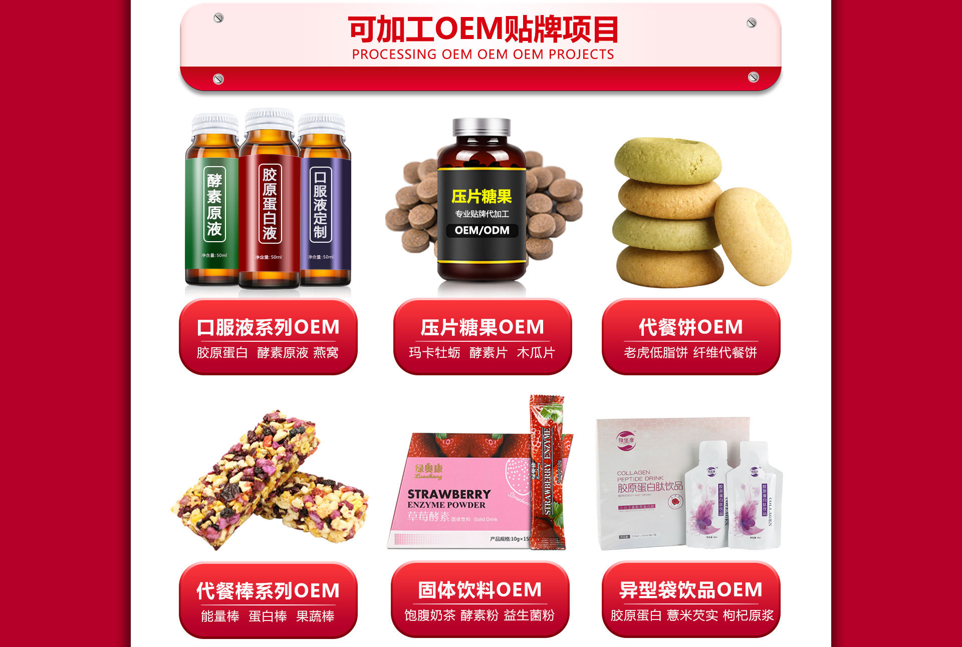 廣州市卡馨保健食品有限公司是一家專注于現(xiàn)代生物健康產(chǎn)品集研發(fā)、生產(chǎn)、銷售、服務(wù)為一體的綜合性現(xiàn)代化企業(yè); 公司通過了HACCP、ISO2200、認(rèn)證,具備完整的產(chǎn)品質(zhì)量控制和保障體系,公司自成立以來,已擁有獨(dú)立產(chǎn)品研發(fā)實(shí)驗(yàn)室,擁有強(qiáng)大的研發(fā)團(tuán)隊(duì),高級(jí)專業(yè)技術(shù)人才,獲高新技術(shù)生產(chǎn)工廠企業(yè)。 公司以強(qiáng)大的技術(shù)支持平臺(tái)、國(guó)家規(guī)范化管理工廠為依托,并與國(guó)內(nèi)多家集團(tuán)企業(yè)公司等機(jī)構(gòu)達(dá)成了長(zhǎng)期的技術(shù)合作伙伴關(guān)系。 我們對(duì)外提供OEM一站式服務(wù),主要從事業(yè)務(wù)范圍是對(duì)固體飲料、片劑 壓片糖果、軟硬膠囊、酵素果凍、酵素液體等等系列新產(chǎn)品的開發(fā)、生產(chǎn)、包裝、銷售及OEM一條龍服務(wù)。廣州市卡馨保健食品有限公司的誠(chéng)信、實(shí)力和產(chǎn)品質(zhì)量獲得業(yè)界的認(rèn)可。歡迎各界朋友蒞臨參觀、指導(dǎo)和業(yè)務(wù)洽談。