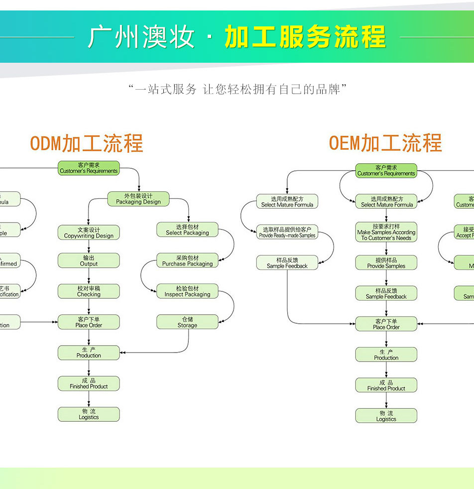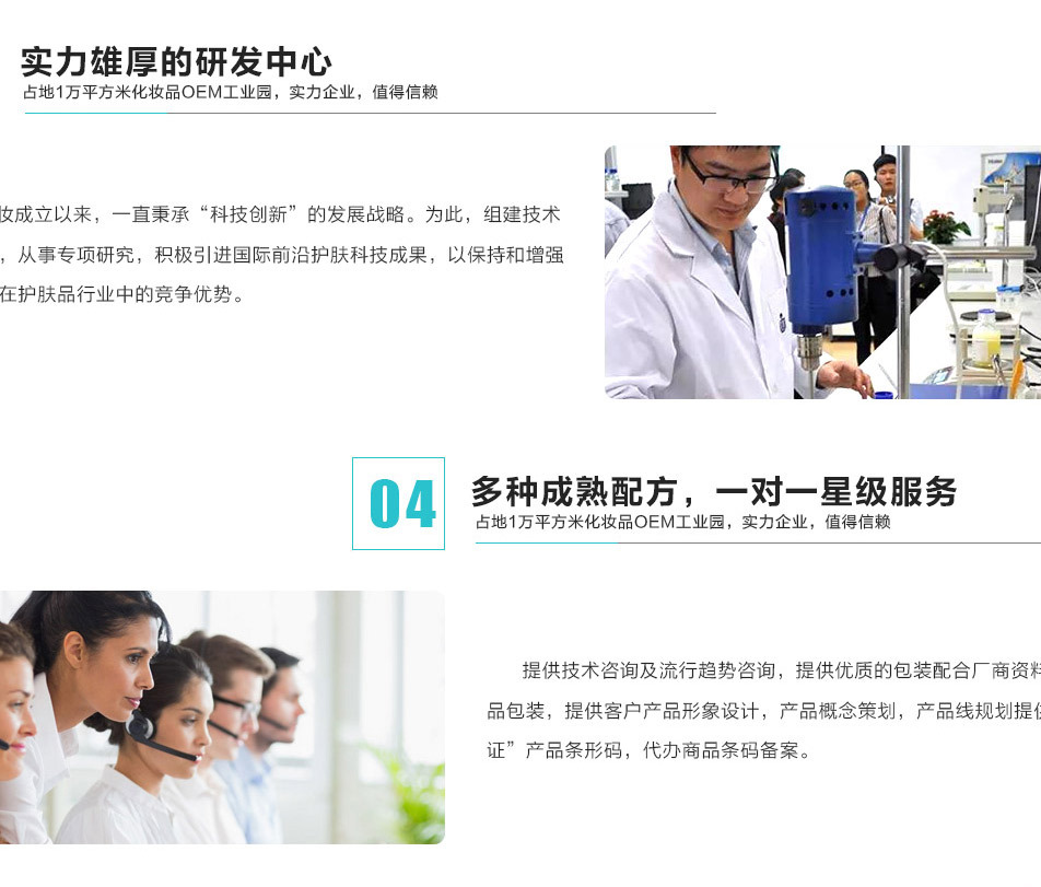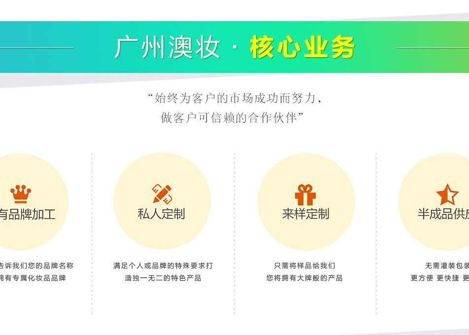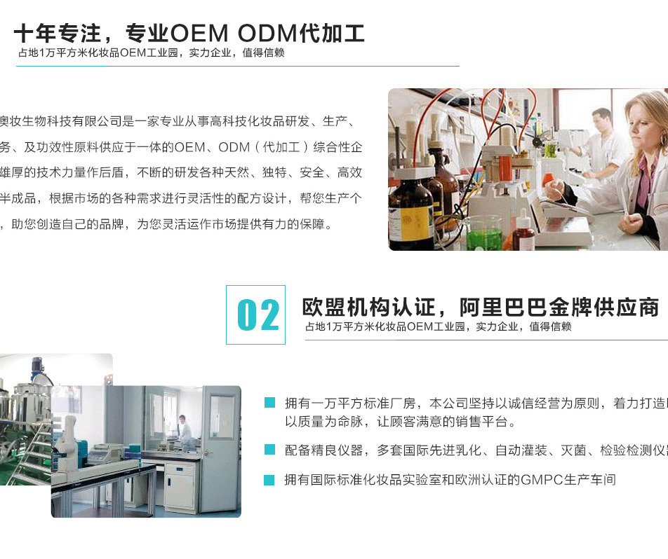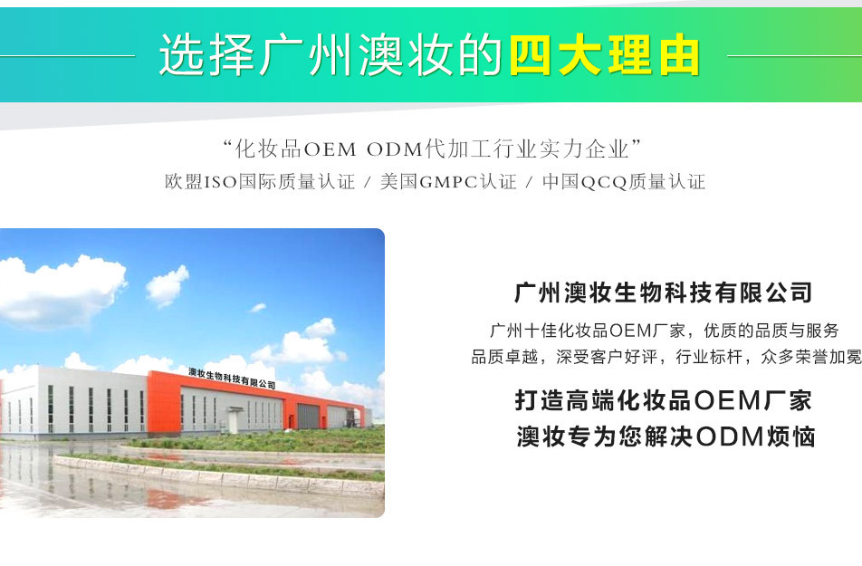 廣州澳妝生物科技有限公司是一家集研發(fā)生產(chǎn)、銷售、服務(wù)、功效型原料供應(yīng)于一體的化妝品OEM/ODM生產(chǎn)企業(yè)。 提供從品牌注冊、產(chǎn)品策劃、配方研發(fā)、包裝設(shè)計、包材采購、成品生產(chǎn)、送檢備案一站式無憂服務(wù),真正為客戶做到管家式服務(wù)。 已通過ISO22716:2007管理體系、歐盟GMPC化妝品良好生產(chǎn)規(guī)范認證,是美國的FDA認證企業(yè),為您提供安全有保障的生產(chǎn)平臺。 關(guān)于我們 廣州柏妝生物科技有限公司是一家集研發(fā)生產(chǎn)、銷售、服務(wù)、功效原料供應(yīng)于一體的化妝品OEM/ODM生產(chǎn)企業(yè)。 從經(jīng)營國內(nèi)外眾多高科技化妝品原料開始,一直進行配方的研發(fā)、臨床、創(chuàng)新、加工,并以歐美、日韓多家生物技術(shù)公司為背景,積累了豐富的研發(fā)、生產(chǎn)經(jīng)驗及穩(wěn)定優(yōu)質(zhì)的成熟配方,根據(jù)您品牌的需求合理推薦安全高效的成熟配方并給予技術(shù)指導(dǎo)。