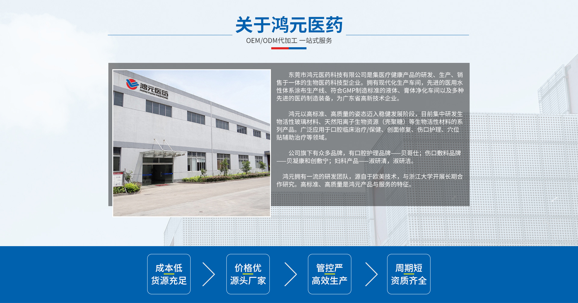 東莞市鴻元醫(yī)藥科技有限公司是集醫(yī)療健康產(chǎn)品的研發(fā)、生產(chǎn)、銷售于一體的生物醫(yī)藥科技型企業(yè)。我們主要以對(duì)人體安全無(wú)害的生物材料作為主要研發(fā)目標(biāo),如納米生物活性玻璃(骨粉)、海洋生物提取物殼聚糖,開(kāi)發(fā)出適用于口腔治療/保?。ㄘ惛缡薆gfresh®)、傷口敷料(貝凝康®、鴻舒寧®、創(chuàng)敷寧®)、康復(fù)理療(穴位磁療貼®)、婦科(淑妍清®、淑妍潔®)、肛腸科等領(lǐng)域的品牌產(chǎn)品。 鴻元醫(yī)藥®擁有現(xiàn)代化生產(chǎn)車間,先進(jìn)的醫(yī)用水性體系涂布生產(chǎn)線、符合GMP制造標(biāo)準(zhǔn)的液體、膏體凈化車間以及多種先進(jìn)的醫(yī)藥制造裝備。 鴻元醫(yī)藥®擁有一流的研發(fā)團(tuán)隊(duì),與國(guó)內(nèi)多家知名大學(xué)浙江大學(xué)、廣東醫(yī)科大學(xué)均有開(kāi)展長(zhǎng)期合作項(xiàng)目。全線產(chǎn)品符合CFDA的標(biāo)準(zhǔn)要求制造,具有循證醫(yī)學(xué)依據(jù),并通過(guò)嚴(yán)格臨床測(cè)試,對(duì)用戶和社會(huì)具有高度的責(zé)任感。