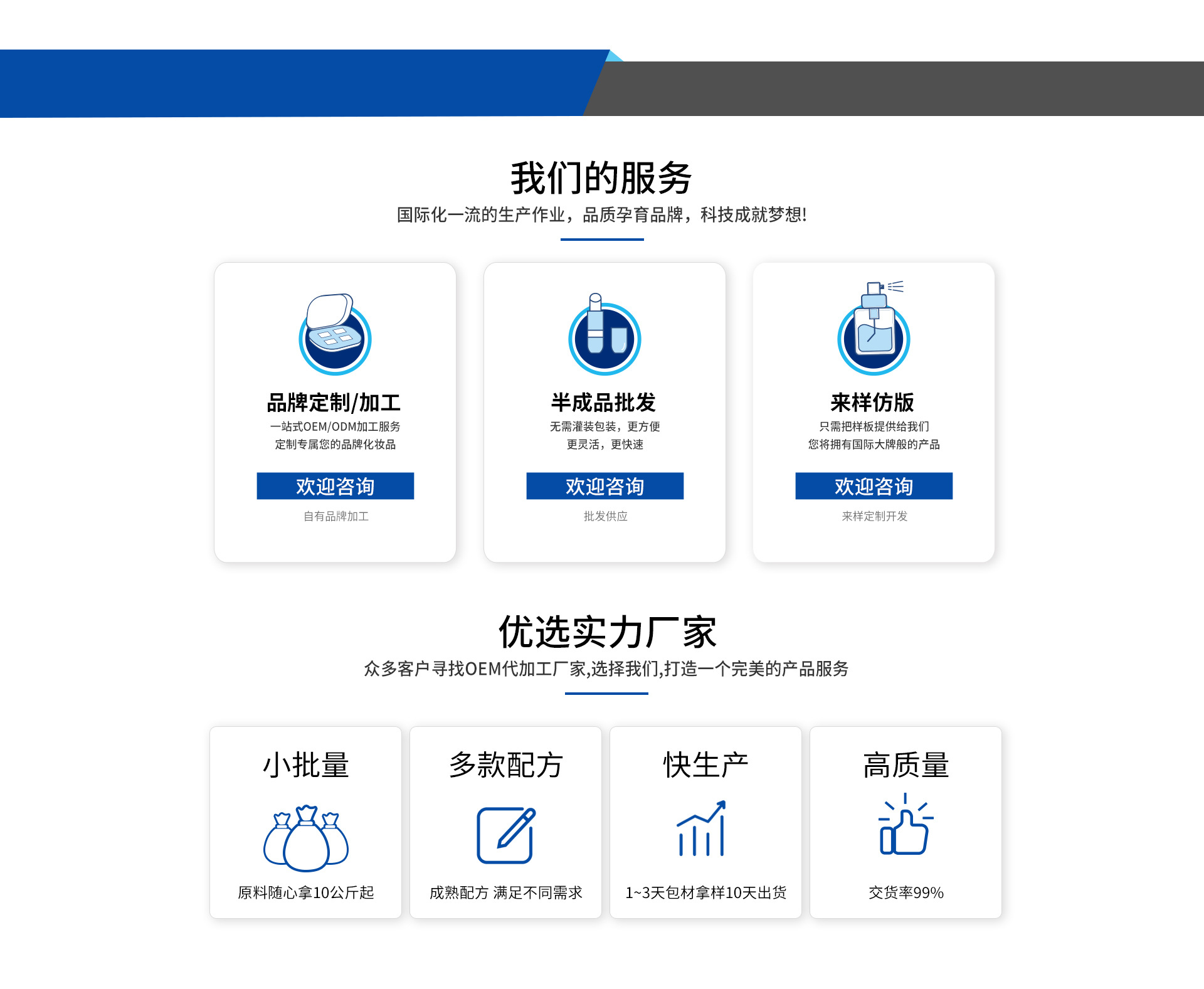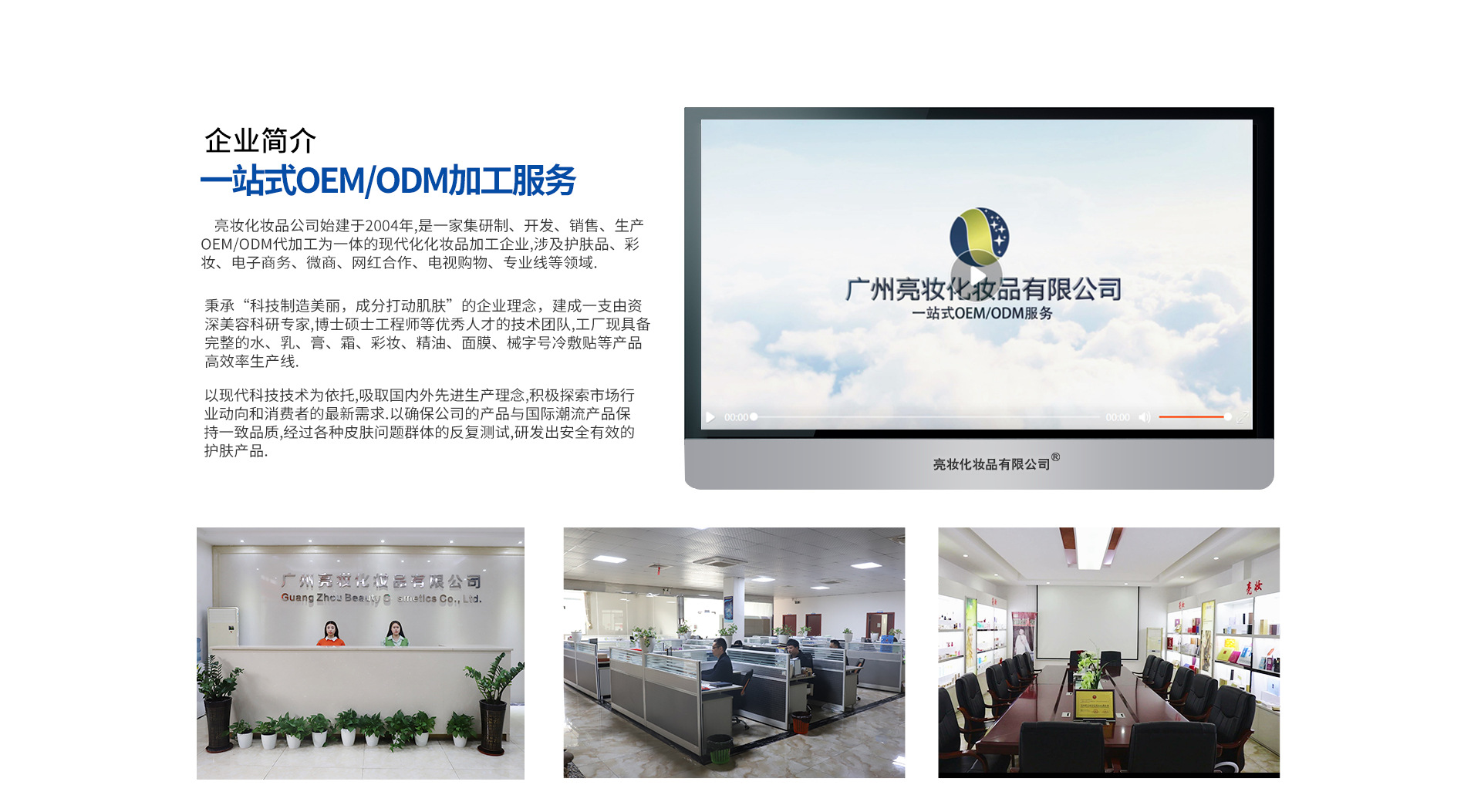 廣州亮妝化妝品公司,是一家集研制、開(kāi)發(fā)、銷(xiāo)售、生產(chǎn)OEM/ODM代加工為一體的現(xiàn)代化化妝品加工企業(yè),涉及護(hù)膚品、彩妝、電子商務(wù)、微商、網(wǎng)紅合作、電視購(gòu)物、專(zhuān)業(yè)線等領(lǐng)域。秉承“科技制造美麗,成分打動(dòng)肌膚”的企業(yè)理念,建成一支由資深美容科研專(zhuān)家,博士碩士工程師等優(yōu)秀人才的技術(shù)團(tuán)隊(duì),工廠現(xiàn)具備完整的水、乳、膏、霜、彩妝、精油、面膜、械字號(hào)冷敷貼等產(chǎn)品高效率生產(chǎn)線。 以現(xiàn)代科技技術(shù)為依托,吸取國(guó)內(nèi)外先進(jìn)生產(chǎn)理念,積極探索市場(chǎng)行業(yè)動(dòng)向和消費(fèi)者的最新需求,以確保公司的產(chǎn)品與國(guó)際潮流產(chǎn)品保持一致品質(zhì),經(jīng)過(guò)各種皮膚問(wèn)題群體的反復(fù)測(cè)試,研發(fā)出安全有效的護(hù)膚產(chǎn)品。