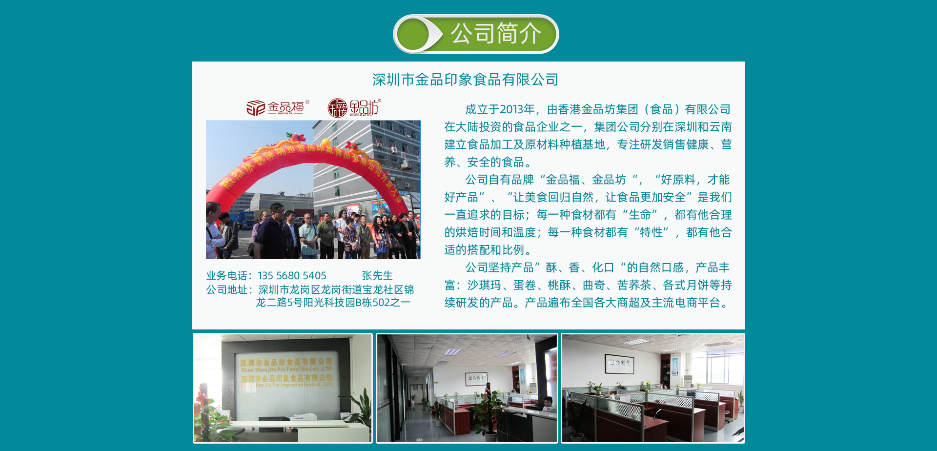 深圳市金品印象食品有限公司是由香港金品坊集團(tuán)(食品)有限公司在大陸投資的食品企業(yè)之一,集團(tuán)公司分別在深圳和云南建立食品加工及原材料種植基地。公司自有品牌“金品福”和“金品坊”品牌系列產(chǎn)品,精選有助于健康的五谷雜糧為烘焙材料,采用傳統(tǒng)工藝和現(xiàn)代科學(xué)配方相結(jié)合,保存原有食材的營(yíng)養(yǎng)價(jià)值,研發(fā)制造出更營(yíng)養(yǎng)更健康的食品。 “好原料,才能好產(chǎn)品”是我們一直堅(jiān)持的品質(zhì)理念;為此,我們嚴(yán)控原材料供應(yīng)源頭,采用傳統(tǒng)工藝,堅(jiān)手工制作,把控生產(chǎn)的每一個(gè)環(huán)節(jié),讓您品嘗到更營(yíng)養(yǎng)、更健康的美味食品。 “讓美食回歸自然,讓食品更加安全”是我們一直追求的目標(biāo);每一種食材都有“生命”,都有他合理的烘焙時(shí)間和溫度;每一種食材都有“特性”,都有他合適的搭配和比例?!笆称钒踩?,我們一直在行動(dòng)”,堅(jiān)持不加色素,不加香精,不加防腐劑,檢驗(yàn)合格出廠的每一批產(chǎn)品,讓您享受更安全、更放心的美味佳肴。