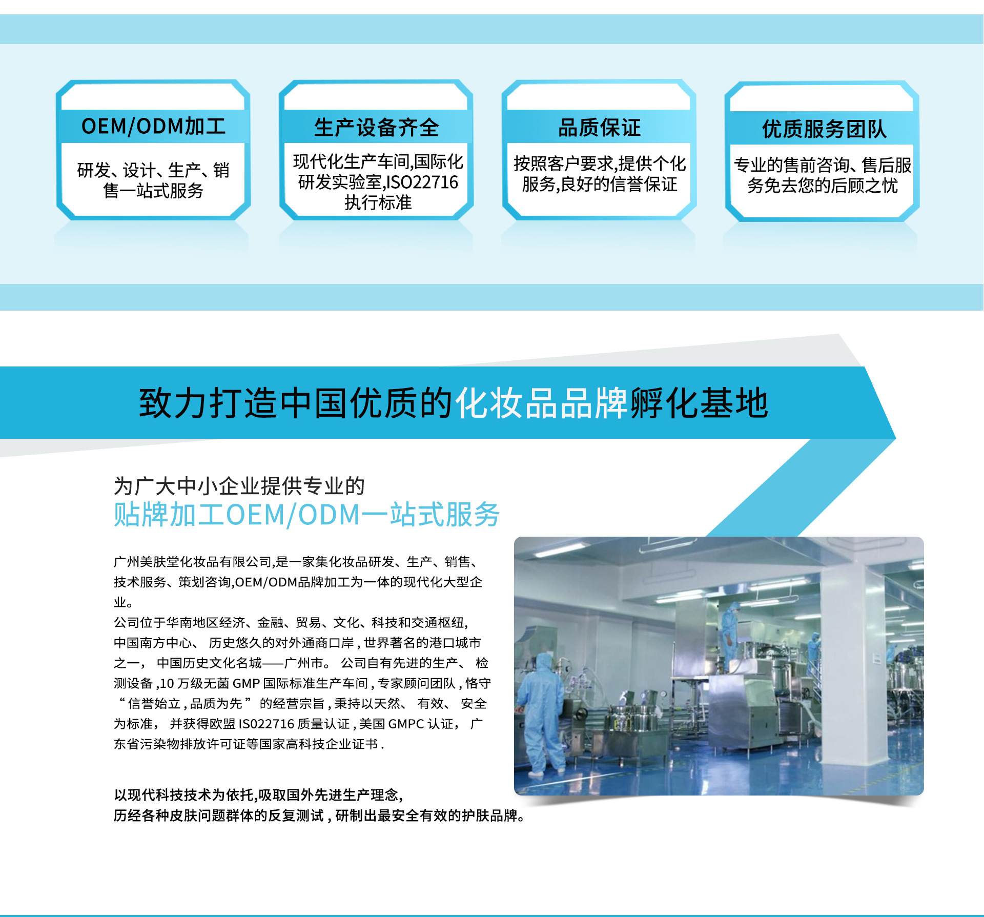 美膚堂(廣州)生物科技有限公司是一家高新技術(shù)企業(yè),為以科研、生產(chǎn)銷售、品牌策劃、全類護膚品OEM代加工、國內(nèi)外貿(mào)易的強大組合。 美膚堂(廣州)生物科技有限公司提出以高新技術(shù)研發(fā)應(yīng)用為企業(yè)打造核心競爭力的目標,做出準確預(yù)判和把握市場動向,順應(yīng)工業(yè)4.0智能化發(fā)展潮流,全程推行MCS、ERP管理系統(tǒng),生產(chǎn)過程數(shù)字化、自動化,嚴格管理企業(yè)精細化工程度,保證生產(chǎn)效率及品質(zhì)。