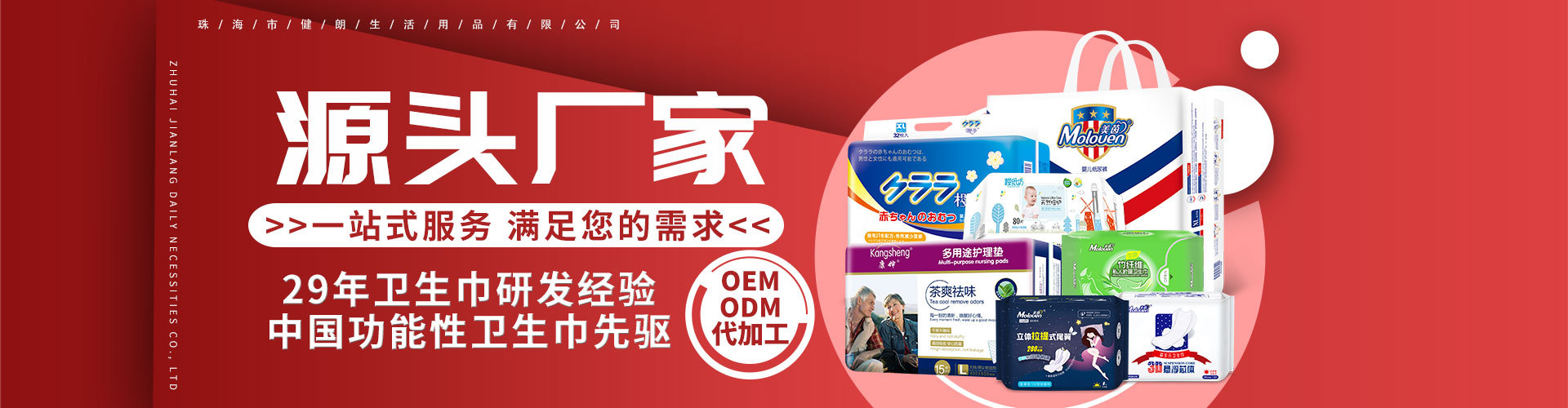 珠海市健朗生活用品有限公司坐落于中國開放改革的前沿、中國著名的浪漫之城——珠海市。 珠海市健朗生活用品有限公司是一家專業(yè)研究、生產(chǎn)、銷售個人護理用品的出口型、科技型企業(yè)。部門設置有:國內(nèi)營銷中心、國際營銷中心、OEM部、網(wǎng)絡營銷中心、直營中心、櫻紙坊連鎖專賣店運營中心、產(chǎn)品研發(fā)中心、生產(chǎn)部(含尿褲車間、濕巾車間、衛(wèi)生巾車間)、質(zhì)控部(含三個質(zhì)檢中心)、機電工程部、策劃部、綜合部、采購部、財務部等機構(gòu)。主要產(chǎn)品包括嬰兒紙尿褲、嬰兒紙尿片、嬰兒隔尿墊、成人紙尿褲、成人紙尿片、多功能護理墊、婦女衛(wèi)生巾、衛(wèi)生護墊、寵物紙尿褲、寵物墊、產(chǎn)婦護理包、濕巾、吸水肉墊、醫(yī)療床單等從0歲到100歲所需的日常護理用品。