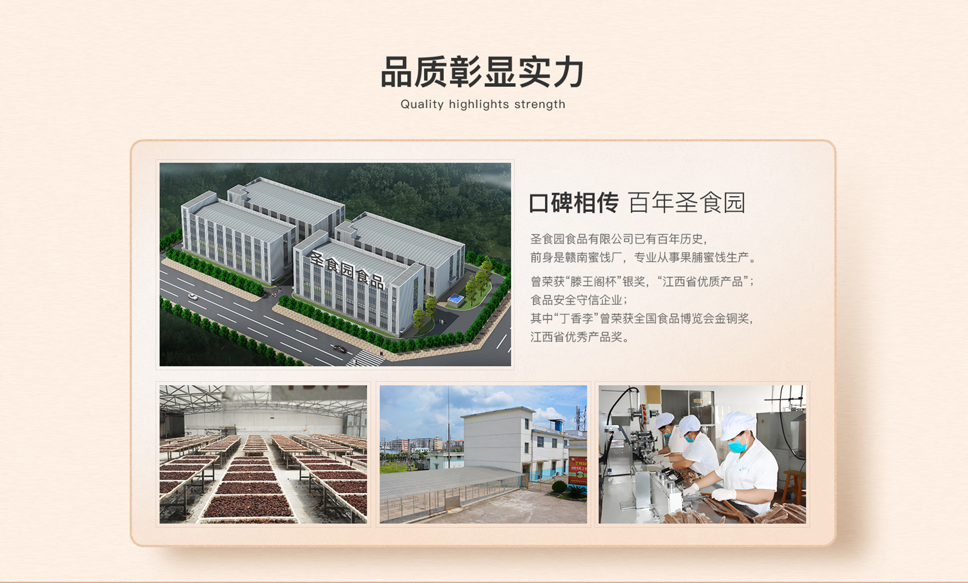 圣食園食品有限公司的前身是贛南蜜餞廠,改革開放后改制為贛州新三梅食品有限公司,后來更名為江西圣食園食品有限公司,從事蜜餞生產(chǎn),公司位于贛州高新技術(shù)產(chǎn)業(yè)園。 江西圣食園食品有限公司主要產(chǎn)品有公司主要生產(chǎn):酸棗糕、百香果糕、芒果糕、臍橙糕、酸杏糕、烏梅糕、等系列果糕類產(chǎn)品。同時生產(chǎn)蜜餞品類的:丁香李(袋裝、罐裝、散裝)、九制楊梅(罐裝)、半話李(罐裝)、烏梅(罐裝)、 雪花楊梅(罐裝)、韓式話梅(罐裝)糖醋姜(罐裝)等蜜餞系列產(chǎn)品。 江西圣食園食品有限公司生產(chǎn)的丁香李曾榮獲2017年贛南蘇區(qū)最具特色食品獎
