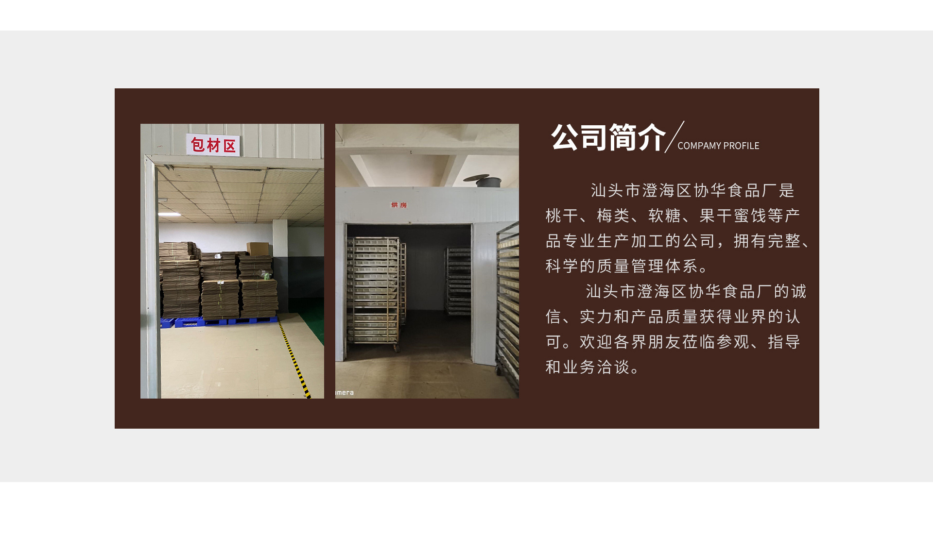 汕頭市澄海區(qū)協(xié)華食品廠是蜜餞、果脯等產(chǎn)品專業(yè)生產(chǎn)加工的公司,擁有完整、科學(xué)的質(zhì)量管理體系。汕頭市澄海區(qū)協(xié)華食品廠的誠信、實力和產(chǎn)品質(zhì)量獲得業(yè)界的認(rèn)可。歡迎各界朋友蒞臨參觀、指導(dǎo)和業(yè)務(wù)洽談。