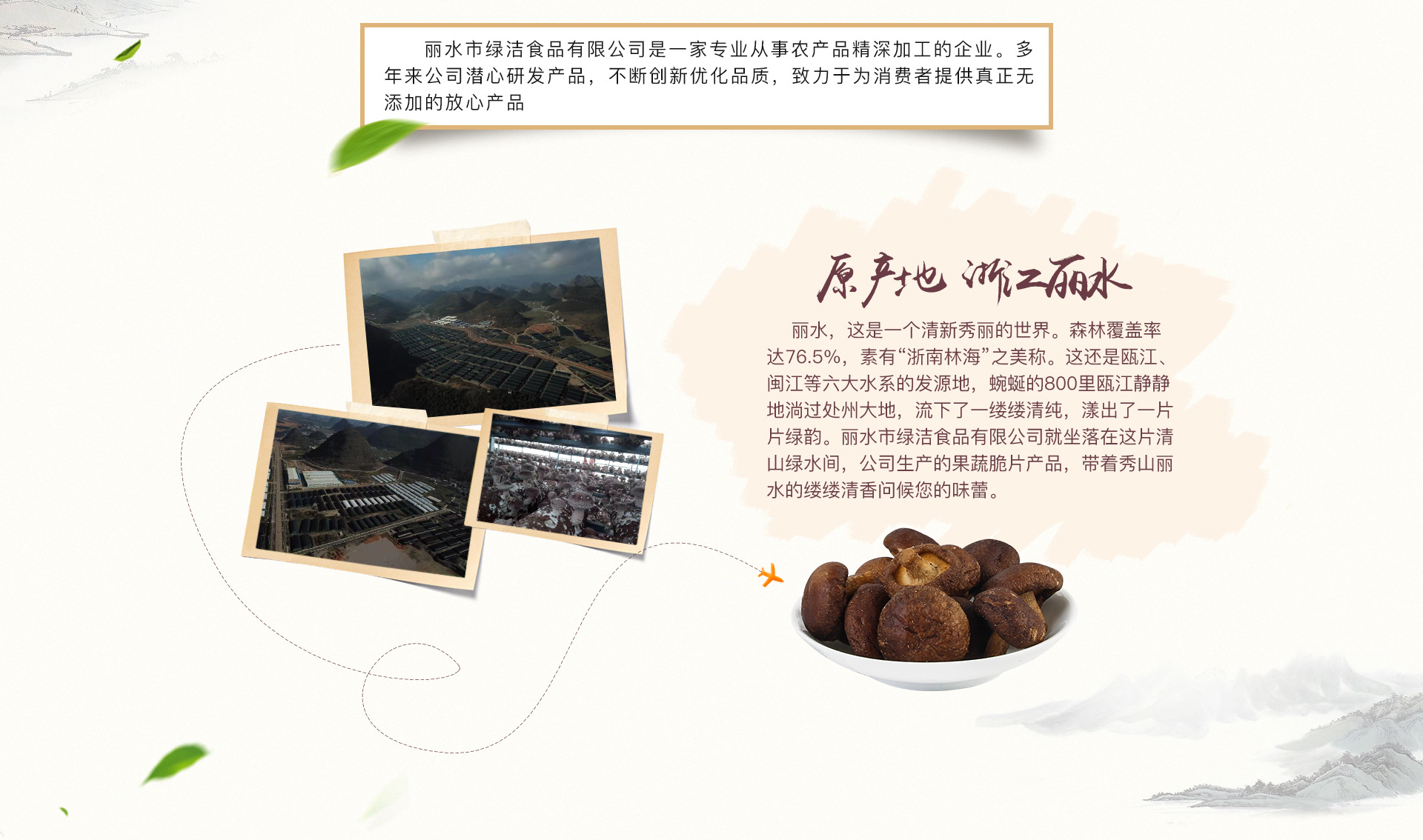 麗水市綠潔食品有限公司坐落于山清水秀的浙江麗水,素有“中國(guó)生態(tài)第一市”、“浙江綠谷”、“華東地區(qū)動(dòng)植物搖籃”等美譽(yù),是國(guó)內(nèi)唯一的全市域的中國(guó)長(zhǎng)壽之鄉(xiāng),享有“秀山麗水,養(yǎng)生福地,長(zhǎng)壽之鄉(xiāng)”的美譽(yù)。 麗水綠潔食品的拳頭產(chǎn)品香菇脆,原料產(chǎn)地為麗水市慶元縣。慶元是香菇的發(fā)源地,慶元香菇有著獨(dú)特的魅力,名揚(yáng)四海,綠水青山就是金山銀山,慶元香菇忠于自然,個(gè)頭均勻,味道鮮美。人工種植、不施化肥農(nóng)藥,一年可采摘3季。 香菇脆是通過(guò)新鮮香菇通過(guò)剪菇腳,清洗、殺青、清洗、冷凍、真空低溫脫水等8道工序,從原料道成品,不添加任何食品添加劑,更健康,更放心。 公司不僅通過(guò)了國(guó)家QS認(rèn)證、9001認(rèn)證,而且榮獲浙江農(nóng)業(yè)博覽會(huì)優(yōu)質(zhì)獎(jiǎng)、蓮都區(qū)重點(diǎn)科技項(xiàng)目承擔(dān)單位、浙江省農(nóng)產(chǎn)品加工示范企業(yè)等稱(chēng)號(hào)?,F(xiàn)又被評(píng)為蓮都區(qū)“重點(diǎn)農(nóng)業(yè)龍頭企業(yè)”。公司歡迎你的加盟與合作!