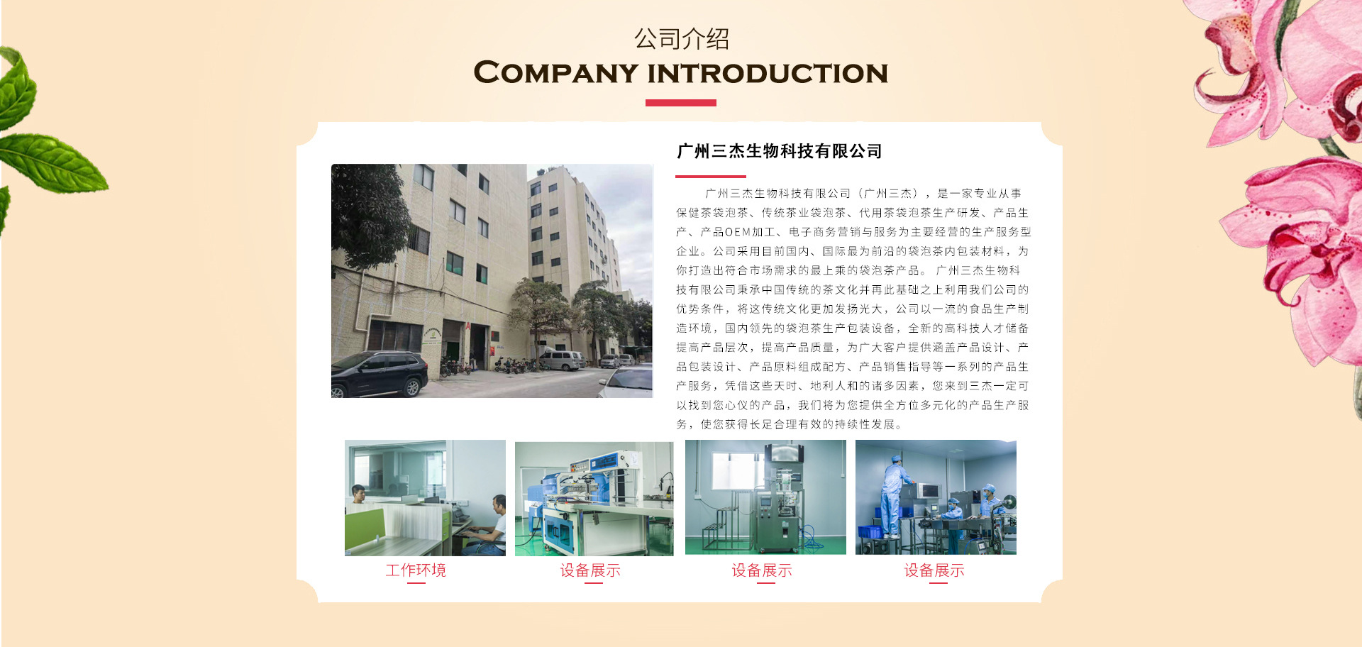 廣州三杰生物科技有限公司(廣州三杰),是一家專業(yè)從事保健茶袋泡茶、傳統(tǒng)茶業(yè)袋泡茶、代用茶袋泡茶生產(chǎn)研發(fā)、產(chǎn)品生產(chǎn)、產(chǎn)品OEM加工、電子商務(wù)營銷與服務(wù)為主要經(jīng)營的生產(chǎn)服務(wù)型企業(yè)。公司采用目前國內(nèi)、國際最為前沿的袋泡茶內(nèi)包裝材料,為你打造出符合市場需求的最上乘的袋泡茶產(chǎn)品。 廣州三杰生物科技有限公司秉承中國傳統(tǒng)的茶文化并再此基礎(chǔ)之上利用我們公司的優(yōu)勢條件,將這傳統(tǒng)文化更加發(fā)揚(yáng)光大,公司以一流的食品生產(chǎn)制造環(huán)境,國內(nèi)領(lǐng)先的袋泡茶生產(chǎn)包裝設(shè)備,全新的高科技人才儲(chǔ)備,提高產(chǎn)品層次,提高產(chǎn)品質(zhì)量,為廣大客戶提供涵蓋產(chǎn)品設(shè)計(jì)、產(chǎn)品包裝設(shè)計(jì)、產(chǎn)品原料組成配方、產(chǎn)品銷售指導(dǎo)等一系列的產(chǎn)品生產(chǎn)服務(wù),憑借這些天時(shí)、地利人和的諸多因素,您來到三杰一定可以找到您心儀的產(chǎn)品,我們將為您提供全方位多元化的產(chǎn)品生產(chǎn)服務(wù),使您獲得長足合理有效的持續(xù)性發(fā)展。