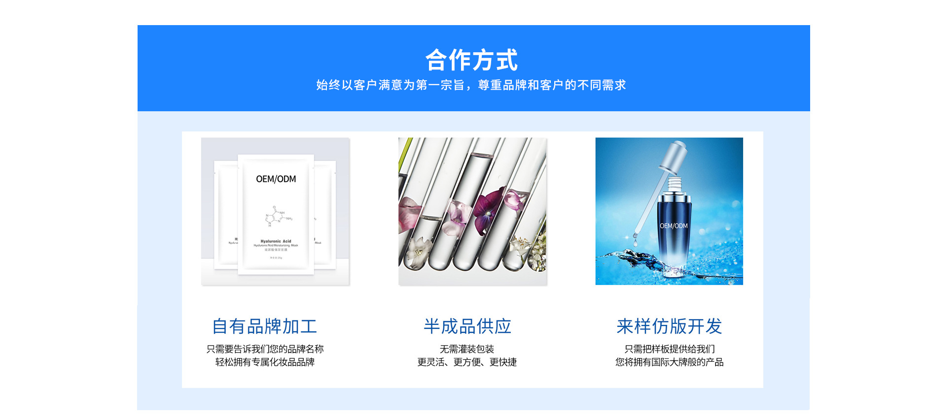 美肌化妝品有限公司是一家集護(hù)膚品/彩妝研發(fā)、原料研制、配方開(kāi)發(fā)、加工生產(chǎn)以及物流配套性服務(wù)為一體的全球化妝品服務(wù)企業(yè)。專注護(hù)膚品貼牌OEM、ODM加工15年、涵括粵妝字號(hào)、械字號(hào)、消字號(hào)、彩妝護(hù)膚,現(xiàn)已取得ISO9001,ISO22716,F(xiàn)DA認(rèn)證和美版GMPC認(rèn)證等進(jìn)出口生產(chǎn)貿(mào)易資質(zhì)及十多項(xiàng)國(guó)家認(rèn)證專利技術(shù)。