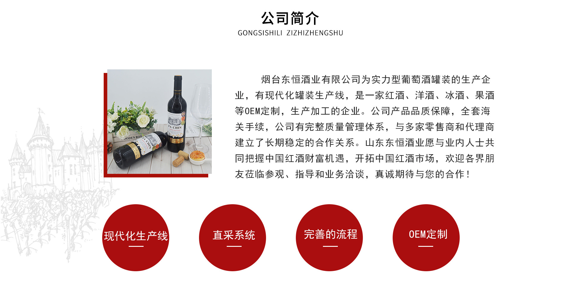 煙臺東恒酒業(yè)有限公司是紅酒、葡萄酒、干紅、酒水等產(chǎn)品專業(yè)生產(chǎn)加工的公司,擁有完整、科學(xué)的質(zhì)量管理體系。煙臺東恒酒業(yè)有限公司的誠信、實(shí)力和產(chǎn)品質(zhì)量獲得業(yè)界的認(rèn)可。歡迎各界朋友蒞臨參觀、指導(dǎo)和業(yè)務(wù)洽談。