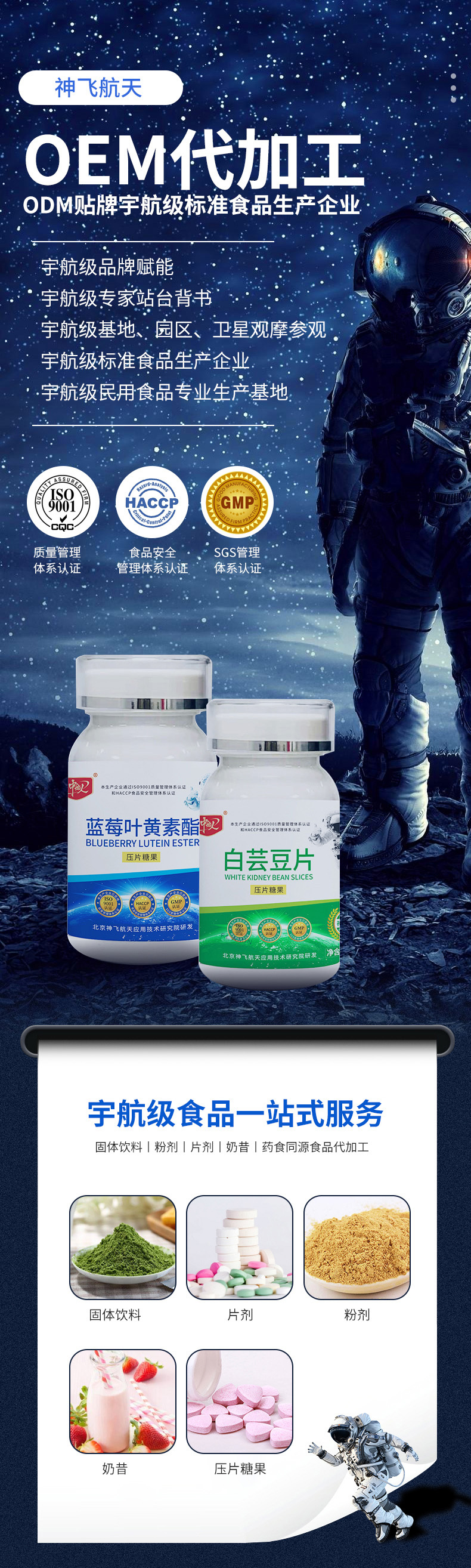 所有原料均經(jīng)過層層篩選,并通過規(guī)范化的生產(chǎn)流程、嚴(yán)格的檢驗(yàn)流程等,使產(chǎn)品品質(zhì)得到了保證。產(chǎn)品按照宇航級民用食品標(biāo)準(zhǔn),由神飛航天專家團(tuán)隊(duì)研發(fā),營養(yǎng)更全面、更均衡、更易于人體吸收。
