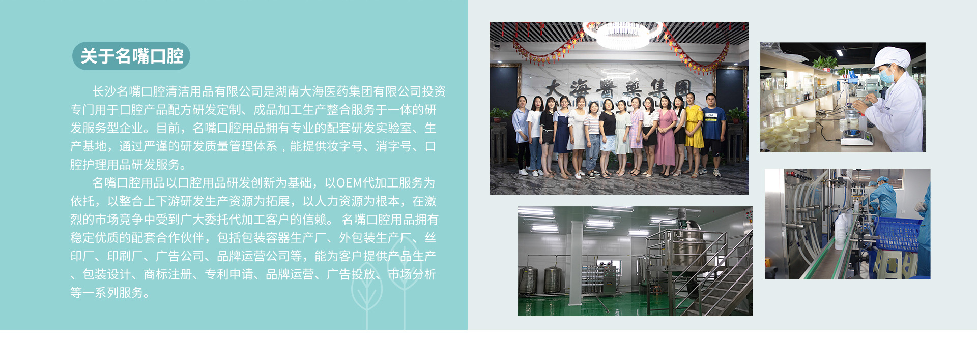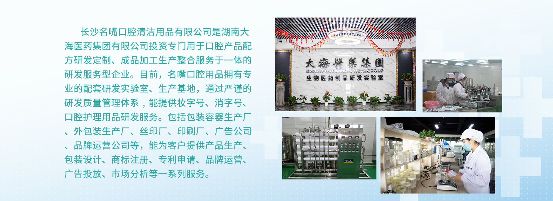 長沙名嘴口腔清潔用品有限公司(以下簡稱:名嘴口腔用品)是湖南大海醫(yī)藥集團有限公司(以下簡稱:大海集團)投資專門用于口腔產(chǎn)品配方研發(fā)定制、成品加工生產(chǎn)整合服務于一體的研發(fā)服務型企業(yè)。目前,名嘴口腔用品擁有專業(yè)的配套研發(fā)實驗室、生產(chǎn)基地,通過嚴謹?shù)难邪l(fā)質(zhì)量管理體系﹐能提供妝字號、消字號、械字號口腔護理用品研發(fā)服務。 名嘴口腔用品以口腔用品研發(fā)創(chuàng)新為基礎,以OEM代加工服務為依托,以整合上下游研發(fā)生產(chǎn)資源為拓展,以人力資源為根本,在激烈的市場競爭中受到廣大委托代加工客戶的信賴。 名嘴口腔用品擁有穩(wěn)定優(yōu)質(zhì)的配套合作伙伴,包括包裝容器生產(chǎn)廠、外包裝生產(chǎn)廠、絲印廠、印刷廠、廣告公司、品牌運營公司等,能為客戶提供產(chǎn)品生產(chǎn)、包裝設計、商標注冊、專利申請、品牌運營、廣告投放、市場分析等一系列服務。 自成立之日起,名嘴口腔用品緊緊抓住市場機遇,認真服務每一位客戶,與時俱進,以市場需求為導向,以科技