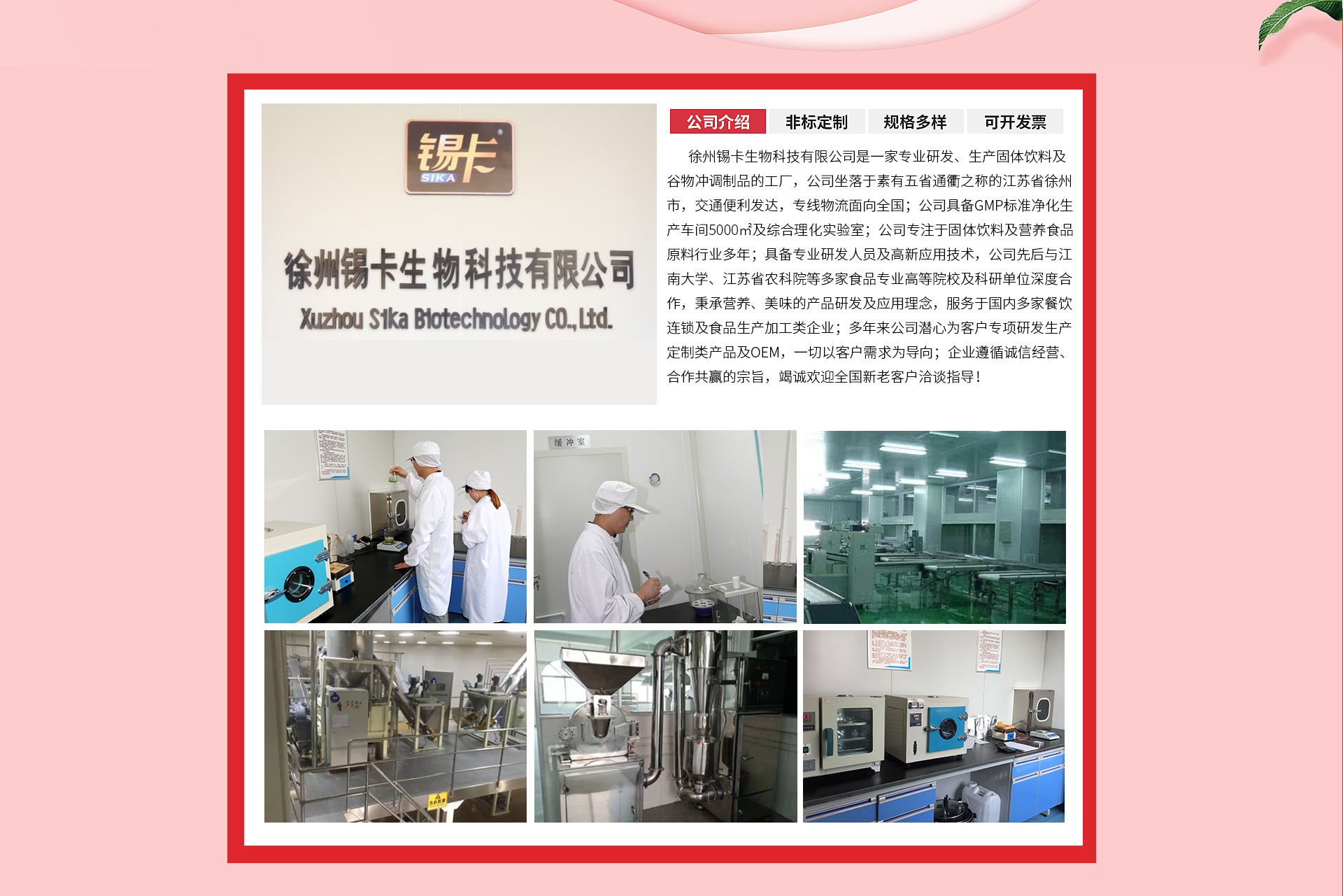 徐州錫卡生物科技有限公司是固體飲料、意式冰淇淋粉、椰子粉、熟化玉米粉、熟化燕麥粉、大米粉、煉乳風(fēng)味粉、牛乳風(fēng)味粉、烤奶風(fēng)味粉、速溶豆奶粉等產(chǎn)品專業(yè)生產(chǎn)加工的公司,擁有完整、科學(xué)的質(zhì)量管理體系。徐州錫卡生物科技有限公司的誠信、實(shí)力和產(chǎn)品質(zhì)量獲得業(yè)界的認(rèn)可。歡迎各界朋友蒞臨參觀、指導(dǎo)和業(yè)務(wù)洽談
