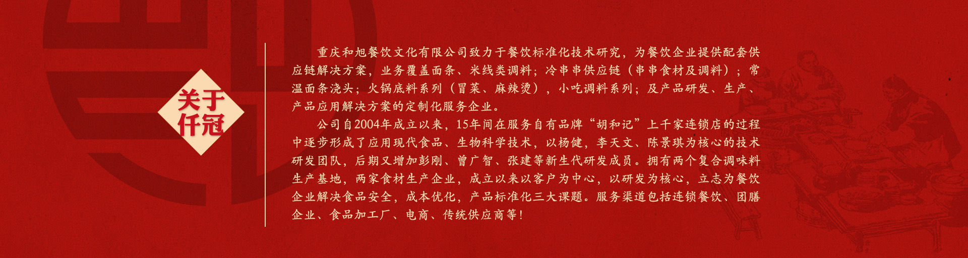 重慶和旭餐飲文化有限公司致力于餐飲標(biāo)準(zhǔn)化技術(shù)研究,為餐飲企業(yè)提供配套供應(yīng)鏈解決方案,業(yè)務(wù)覆蓋火鍋(冒菜、麻辣燙)類,面食、粉、米線類,風(fēng)味魚類(烤魚、紙包魚、啵啵魚)、醬、鹵料類,風(fēng)味小吃類等產(chǎn)品研發(fā)、生產(chǎn)、產(chǎn)品應(yīng)用解決方案的定制化服務(wù)企業(yè)。 公司自2004年成立以來,15年在服務(wù)自有胡和記上千家連鎖品牌的過程中逐步形成了應(yīng)用現(xiàn)代食品、生物科學(xué)技術(shù),以楊健,李天文、陳景琪為核心的技術(shù)研發(fā)團(tuán)隊,后期又增加彭剛、曾廣智、張建等新生代研發(fā)成員。擁有兩個復(fù)合調(diào)味料生產(chǎn)基地,兩家食材生產(chǎn)企業(yè),成立以來以客戶為中心,以研發(fā)為核心,立志為餐飲企業(yè)解決食品安全,成本優(yōu)化,產(chǎn)品標(biāo)準(zhǔn)化三大課題。服務(wù)渠道包括連鎖餐飲、團(tuán)膳企業(yè)、食品加工廠、電商、傳統(tǒng)供應(yīng)商等!