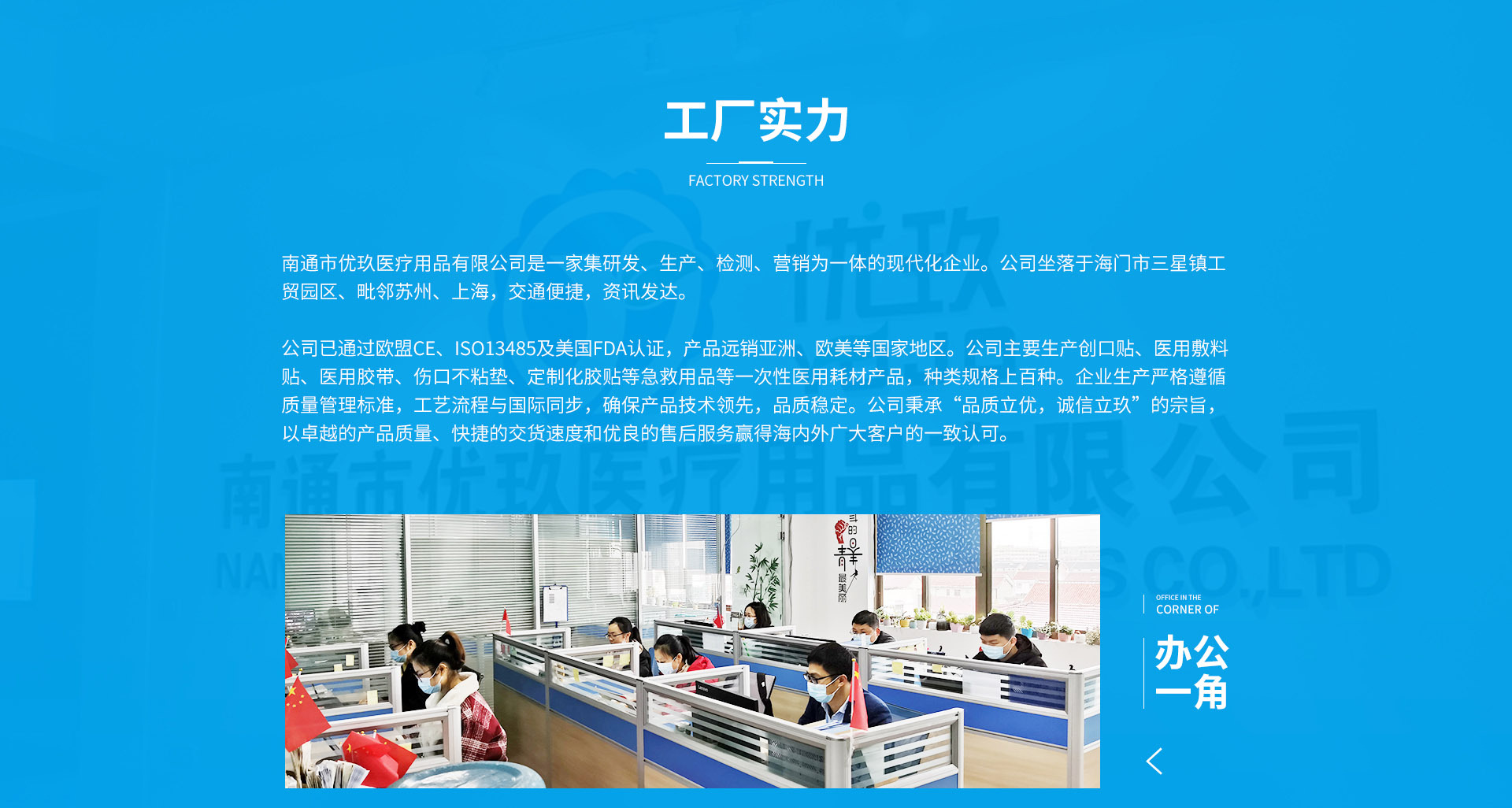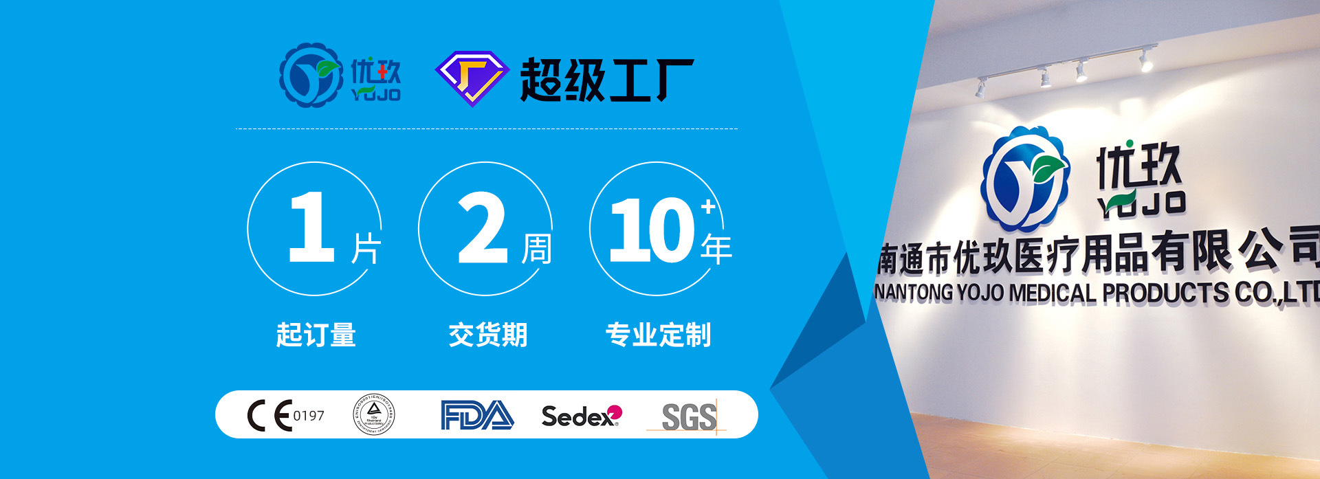 南通市優(yōu)玖醫(yī)療用品有限公司是一家集研發(fā)、生產(chǎn)、檢測(cè)、營(yíng)銷(xiāo)為一體的現(xiàn)代企業(yè)。公司已通過(guò)CE、ISO13485及美國(guó)FDA認(rèn)證,產(chǎn)品遠(yuǎn)銷(xiāo)亞洲、歐美等國(guó)家和地區(qū)。公司主要生產(chǎn)創(chuàng)口貼、醫(yī)用敷料貼、醫(yī)用膠帶、定制化膠貼、傷口不粘墊、吸水墊以及急救用品等一次性醫(yī)用耗材產(chǎn)品,種類(lèi)規(guī)格達(dá)上百種。企業(yè)生產(chǎn)嚴(yán)格遵循質(zhì)量管理標(biāo)準(zhǔn),工藝流程與國(guó)際同步,確保產(chǎn)品技術(shù)領(lǐng)先,品質(zhì)穩(wěn)定。 公司秉承“品質(zhì)立優(yōu),誠(chéng)信立玖”的宗旨,以卓越的產(chǎn)品質(zhì)量、快捷的交貨速度和優(yōu)良的售后服務(wù)贏得海內(nèi)外廣大客戶(hù)的一致認(rèn)可。