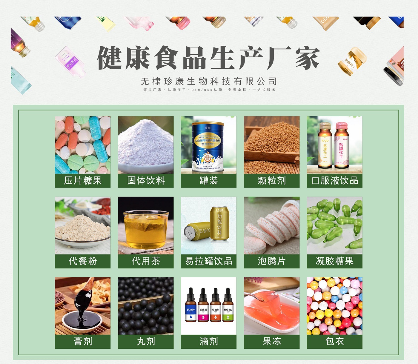 無棣珍康生物科技有限公司是一家有十萬級GMP凈化車間和市級工程技術(shù)研究中心的 健康食品生產(chǎn)企業(yè)。公司總部位于山東省濟(jì)南市,工廠在濱州無棣縣舜園工業(yè)園建立 占地3000平方米的規(guī)范化生產(chǎn)基地,服務(wù)網(wǎng)絡(luò)覆蓋28各省/市/自治區(qū)的各大營銷公司。 無棣?珍康生物科技有限公司生產(chǎn)產(chǎn)品品類涵蓋片劑、粉劑、顆粒劑、口服液、袋泡茶、 凝膠糖果、丸劑、泡騰片、包衣等多種劑型,并形成了產(chǎn)品代加工生產(chǎn)鏈。但是與其他 OEM代加工工廠不同的是,山東無棣?珍康生物科技有限公司不是簡單的規(guī)模、產(chǎn)能、 價(jià)格,根據(jù)不同的市場形勢為您提供私人訂制服務(wù)。在國內(nèi)健康品市場一片亂象和信 任危機(jī)之中,山東無棣珍康生物科技有限公司以質(zhì)量贏得市場信賴;這里將是您產(chǎn)品技 術(shù)追求的終點(diǎn),這里將是您量身定制個(gè)性化賣點(diǎn),讓客戶的產(chǎn)品搶先一步。