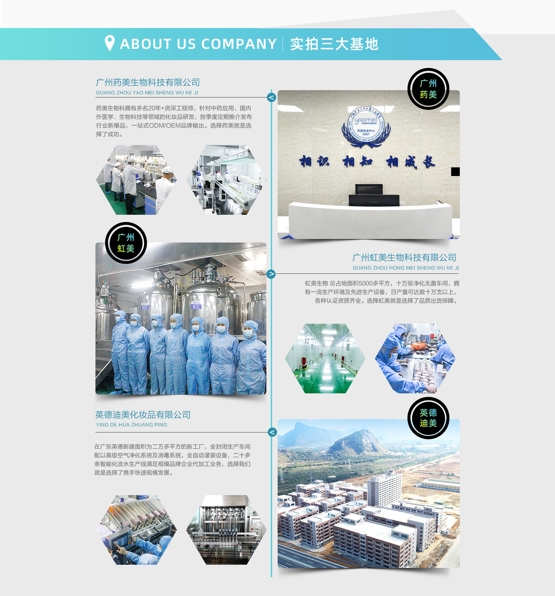 廣州虹美生物科技有限公司是OEM護膚品代工、ODM護膚品代、OEM化妝品代工、ODM化妝品代等產(chǎn)品專業(yè)生產(chǎn)加工的公司,擁有完整、科學的質(zhì)量管理體系。 廣州虹美生物科技有限公司,前身是廣州市顏姬化妝品有限公司,創(chuàng)建于2007年,十四年歷程,2017年公司調(diào)整為“雙基地”模式即“藥美研發(fā)中心”與“迪美生產(chǎn)基地”; GMPC生產(chǎn)標準,十萬級凈化無菌車間,總占地面積2萬平方,大量先進的生產(chǎn)設備,實現(xiàn)專利成分的高質(zhì)量生產(chǎn)。 以中藥應用、國內(nèi)外醫(yī)學、皮膚學、生物科技為主導的高新技術企業(yè), 強大的研發(fā)團隊,擁有多名業(yè)內(nèi)資深工程師針對中藥應用、國內(nèi)外醫(yī)學、皮膚學、生物科技等領域的化妝品研發(fā)。 虹美公司優(yōu)勢 1、生產(chǎn)優(yōu)勢 三大生產(chǎn)基地,占地面積為2萬多平方的工廠,生產(chǎn)程序嚴格遵照GMPC生產(chǎn)標準,擁有先進的生產(chǎn)設備及一流生產(chǎn)環(huán)境。通過全封閉生產(chǎn)車間配以高級空氣凈化系統(tǒng)及消毒系統(tǒng),灌裝設備應用氣動裝置
