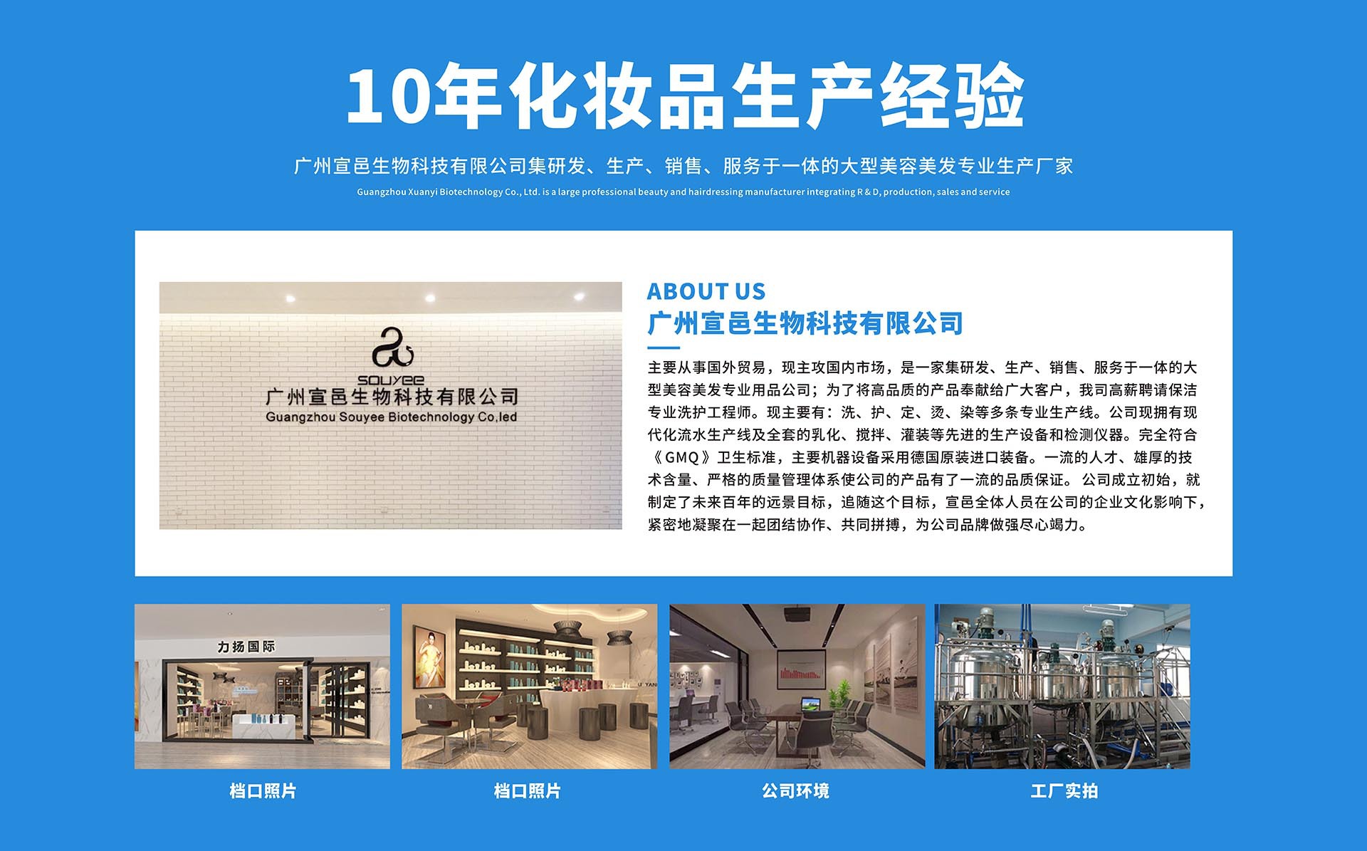 廣州宣邑生物科技有限公司主要從事國外貿(mào)易,現(xiàn)主攻國內(nèi)市場,是一家集研發(fā)、生產(chǎn)、銷售、服務(wù)于一體的大型美容美發(fā)專業(yè)用品公司;為了將高品質(zhì)的產(chǎn)品奉獻(xiàn)給廣大客戶,我司高薪聘請保潔專業(yè)洗護(hù)工程師?,F(xiàn)主要有:洗、護(hù)、定、燙、染等多條專業(yè)生產(chǎn)線。公司現(xiàn)擁有現(xiàn)代化流水生產(chǎn)線及全套的乳化、攪拌、灌裝等先進(jìn)的生產(chǎn)設(shè)備和檢測儀器。完全符合《GMQ》衛(wèi)生標(biāo)準(zhǔn),主要機(jī)器設(shè)備采用德國原裝進(jìn)口裝備。一流的人才、雄厚的技術(shù)含量、嚴(yán)格的質(zhì)量管理體系使公司的產(chǎn)品有了一流的品質(zhì)保證。 公司成立初始,就制定了未來百年的遠(yuǎn)景目標(biāo),追隨這個(gè)目標(biāo),宣邑全體人員在公司的企業(yè)文化影響下,緊密地凝聚在一起團(tuán)結(jié)協(xié)作、共同拼搏,為公司品牌做強(qiáng)盡心竭力。