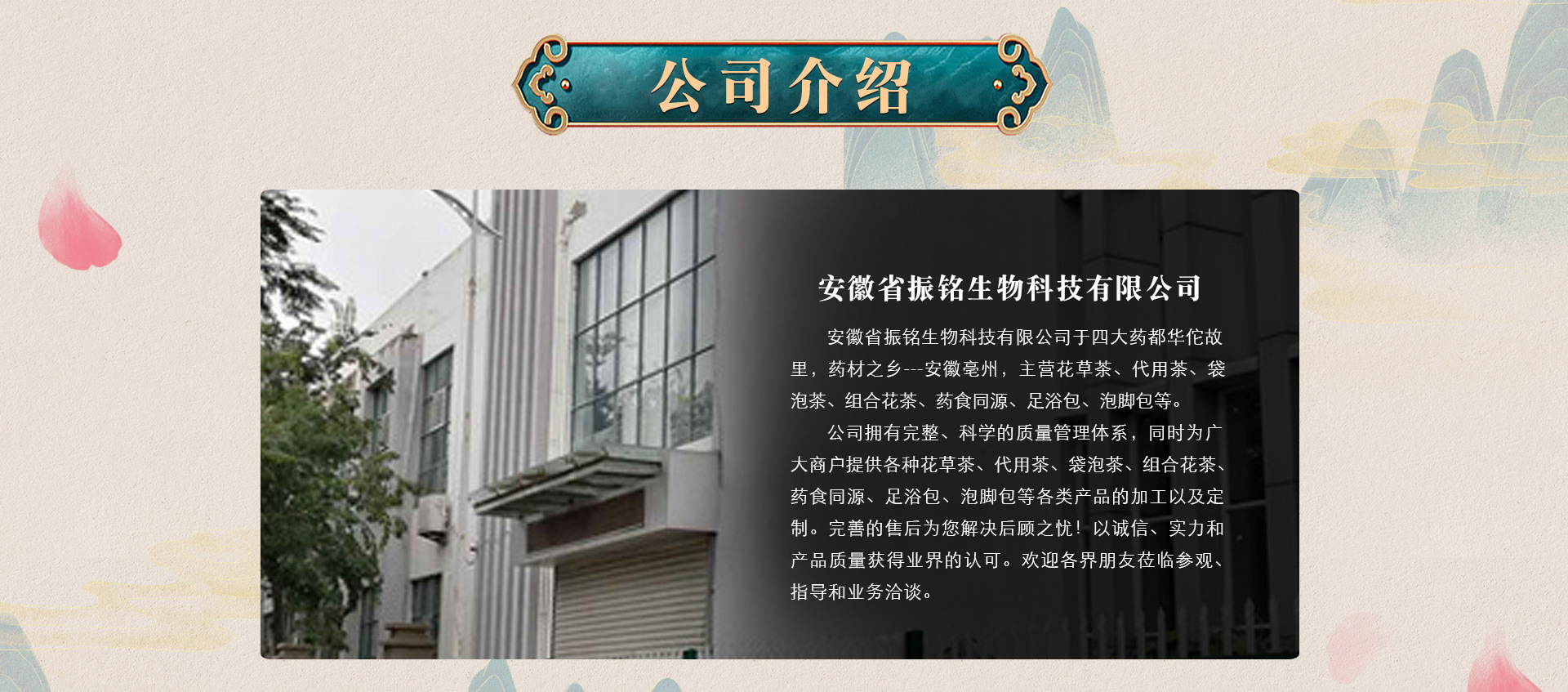 安徽省振銘生物技有限公司于全國(guó)四大藥都 華佗故里,藥材之鄉(xiāng)---安徽亳州,主營(yíng)足浴包,泡腳包,花草茶、養(yǎng)生茶、代用茶、袋泡茶、藥食同源、組合花茶,公司擁有完整、科學(xué)的質(zhì)量管理體系,同時(shí)為廣大商戶提供各種足浴包、泡腳包、泡澡包、花草茶、養(yǎng)生茶、代用茶、藥食同源、組合花茶等各類產(chǎn)品的加工以及定制。完善的售后為您解決后顧之憂!以誠(chéng)信、實(shí)力和產(chǎn)品質(zhì)量獲得業(yè)界的認(rèn)可。歡迎各界朋友蒞臨參觀、指導(dǎo)和業(yè)務(wù)洽談。