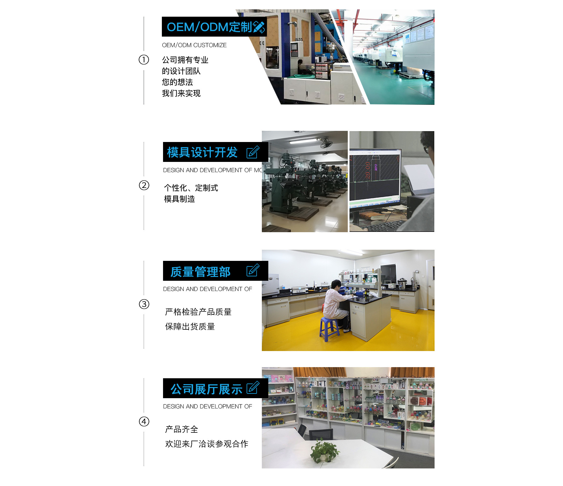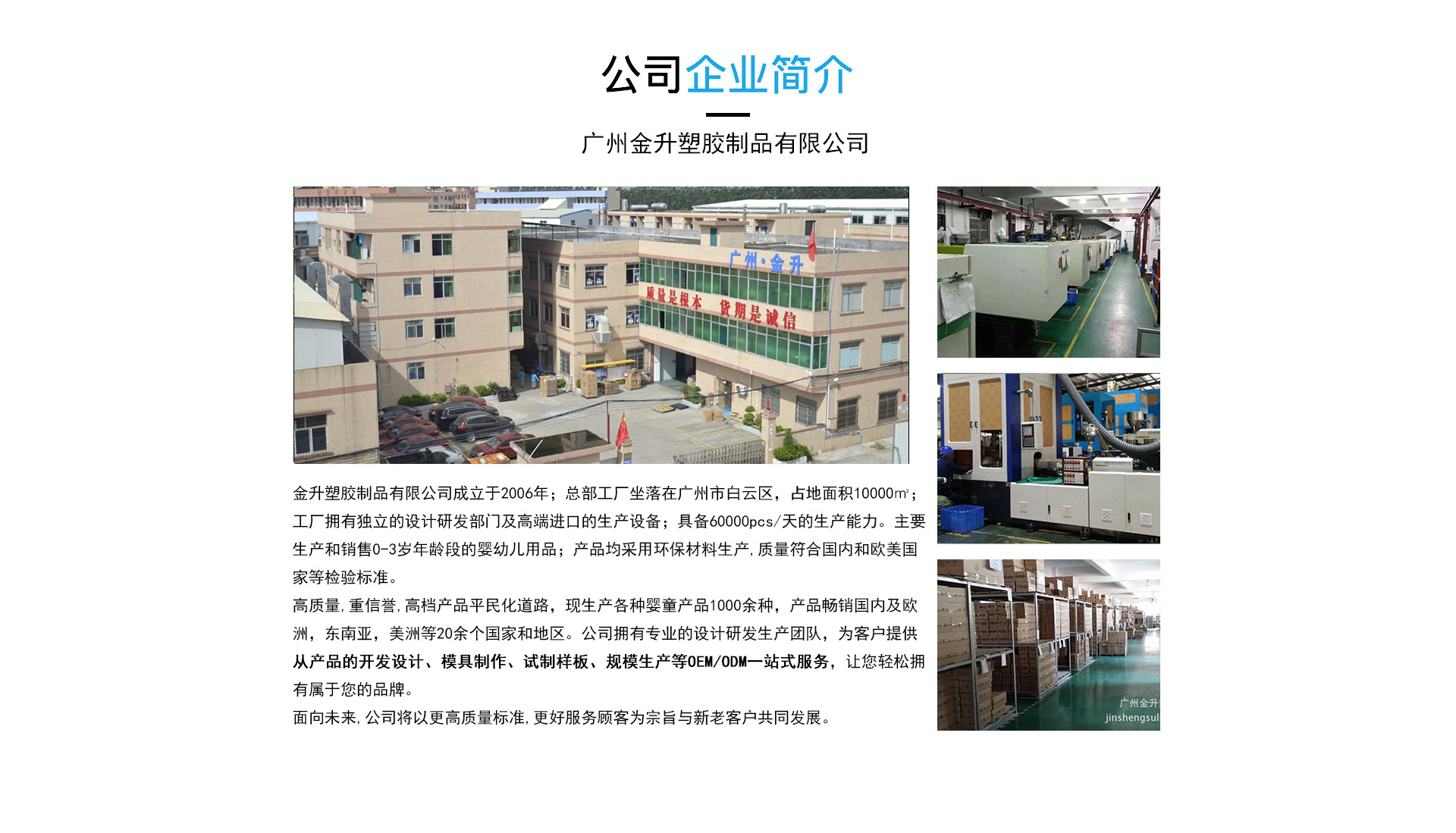 廣州金升塑膠制品有限公司 金升塑膠制品有限公司成立于2006年; 總部工廠坐落在廣州市白云區(qū)人和鎮(zhèn)東華工業(yè)區(qū)同貴路8號A2園區(qū),占地面積10000㎡; 工廠擁有行業(yè)內(nèi)領(lǐng)先的設(shè)計研發(fā)部門及一流的生產(chǎn)設(shè)備;具備60000pcs/天的生產(chǎn)能力。 主要生產(chǎn)和銷售0-3歲年齡段的嬰幼兒用品; 包括:嬰兒奶瓶系列、奶嘴系列、餐具系列、杯壺系列、健康護理清潔系列、母嬰安全生活用品系列等; 產(chǎn)品均采用環(huán)保材料生產(chǎn),質(zhì)量符合國內(nèi)和歐美國家等檢驗標(biāo)準(zhǔn)。 高質(zhì)量,重信譽,高檔產(chǎn)品平民化道路,現(xiàn)生產(chǎn)各種嬰童產(chǎn)品1000余種,產(chǎn)品暢銷國內(nèi)及歐洲,東南亞,美洲等20余個國家和地區(qū)。 公司擁有專業(yè)的設(shè)計研發(fā)生產(chǎn)團隊,為客戶提供從產(chǎn)品的開發(fā)設(shè)計、模具制作、試制樣板、規(guī)模生產(chǎn)等OEM/ODM一站式服務(wù)。