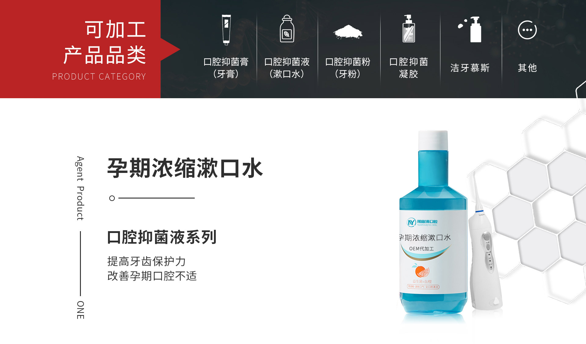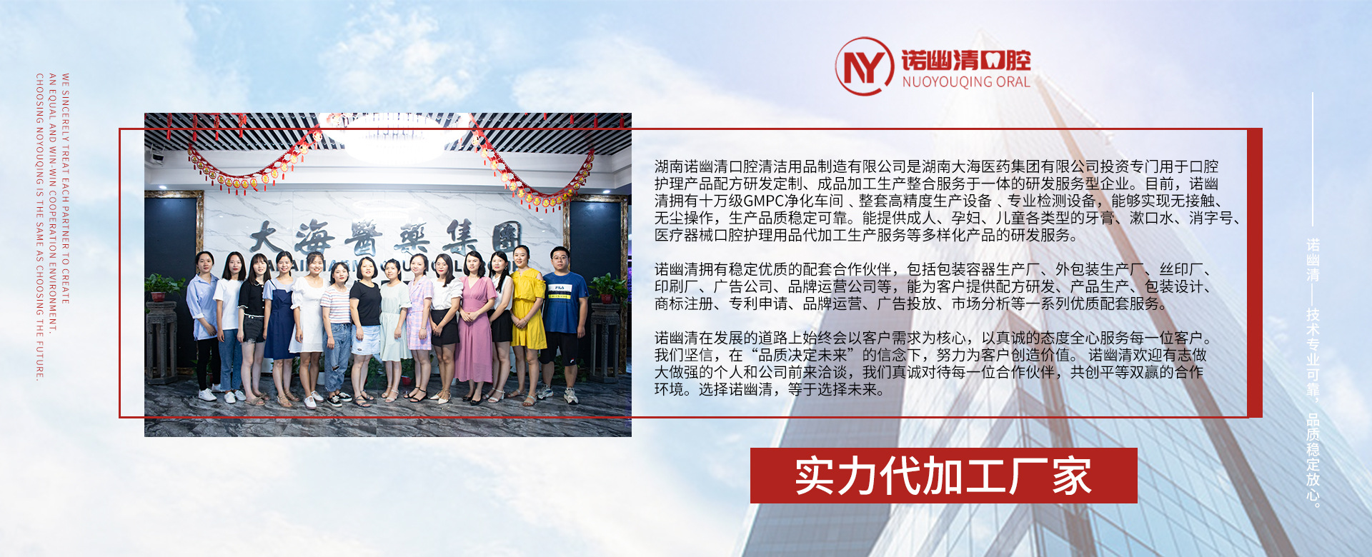 湖南諾幽清口腔清潔用品制造有限公司(以下簡(jiǎn)稱:諾幽清)是湖南大海醫(yī)藥集團(tuán)有限公司(以下簡(jiǎn)稱:大海集團(tuán))投資專門用于口腔護(hù)理產(chǎn)品配方研發(fā)定制、成品加工生產(chǎn)整合服務(wù)于一體的研發(fā)服務(wù)型企業(yè)。目前,諾幽清擁有專業(yè)的配套研發(fā)實(shí)驗(yàn)室、生產(chǎn)基地,通過嚴(yán)謹(jǐn)?shù)难邪l(fā)質(zhì)量管理體系﹐能提供成人、孕婦、兒童各類型的牙膏、漱口水、消字號(hào)、醫(yī)療器械口腔護(hù)理用品代加工生產(chǎn)服務(wù)等多樣化產(chǎn)品的研發(fā)服務(wù)。