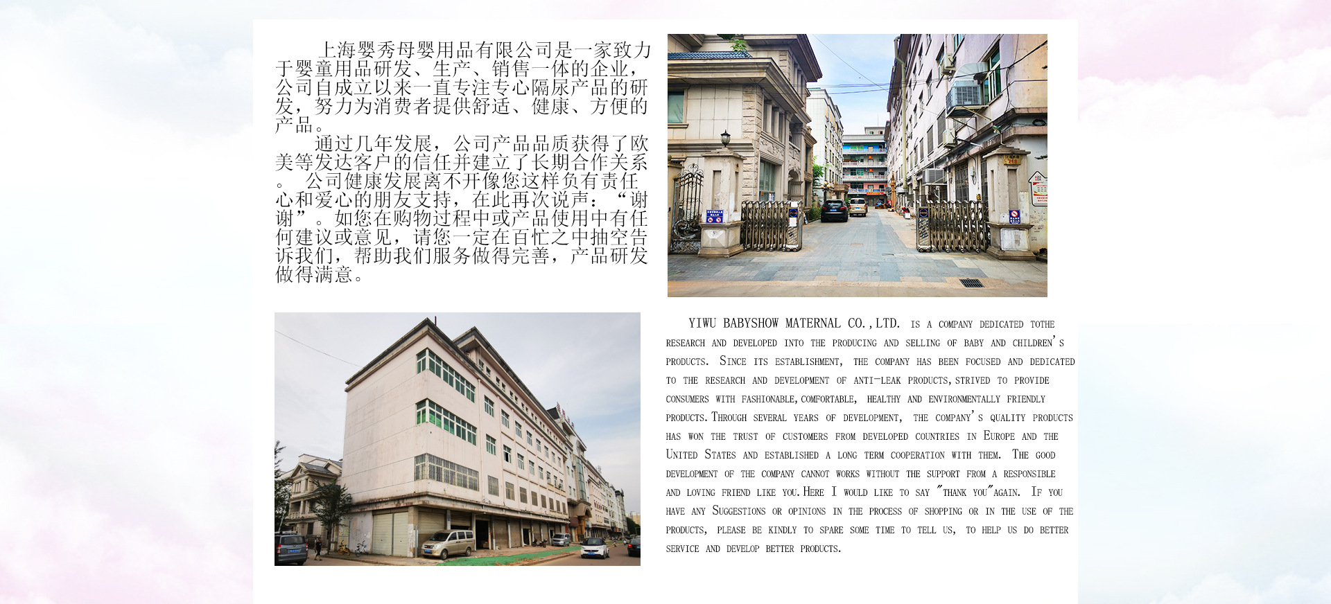 上海嬰秀嬰兒用品有限公司,工貿(mào)一體話,創(chuàng)立至今11年,工廠占地3000平方米,年銷量5000萬(wàn)以上,每年生產(chǎn)出口貨物與逐年遞增擴(kuò)大。 專注于生產(chǎn)母嬰用品,嬰兒布尿褲,尿片,防溢乳墊,衛(wèi)生墊,等可洗重復(fù)使用產(chǎn)品。 支持OEM,不斷開發(fā)新款,創(chuàng)新新款,擁有成熟的生產(chǎn)流水線以及經(jīng)驗(yàn)設(shè)備于員工經(jīng)驗(yàn)