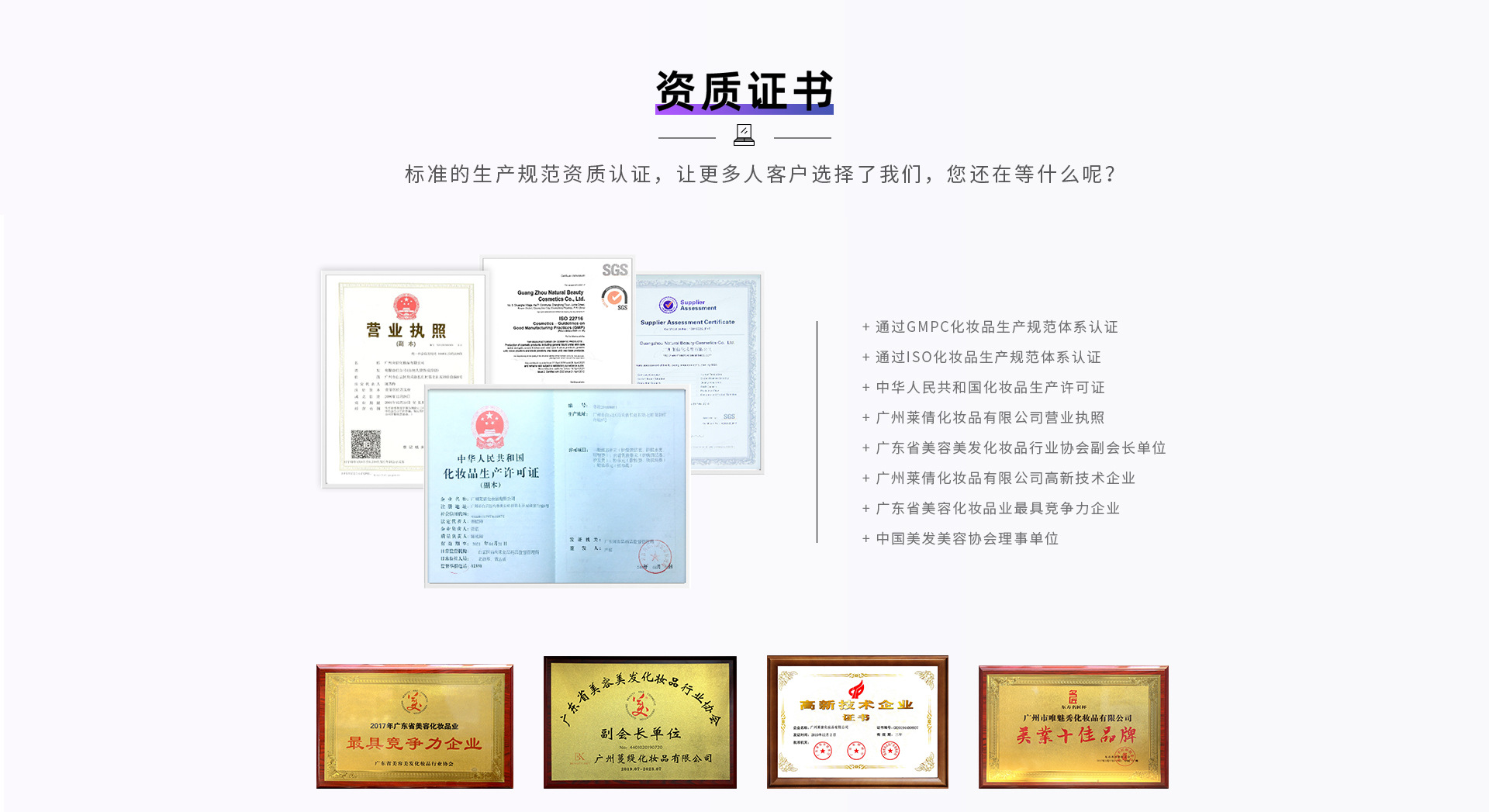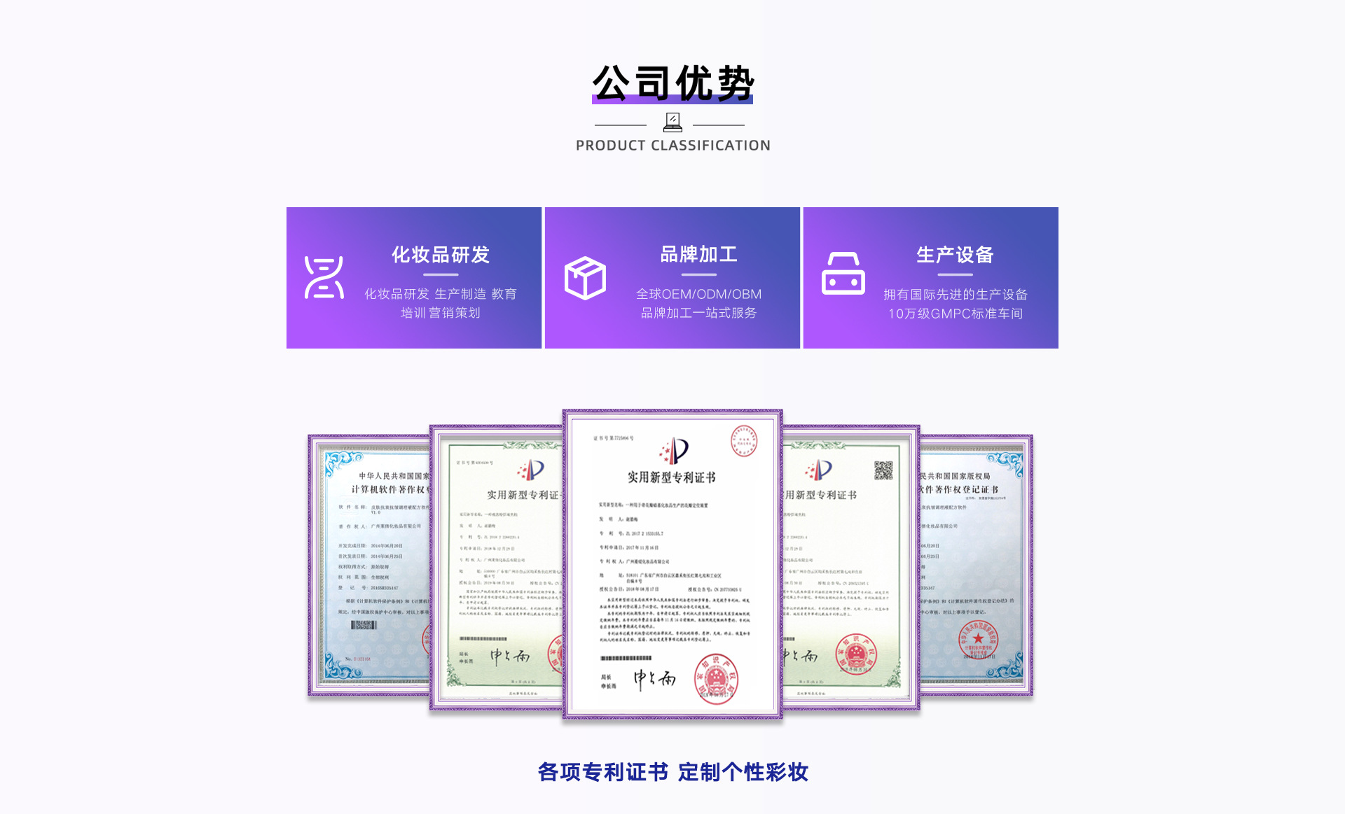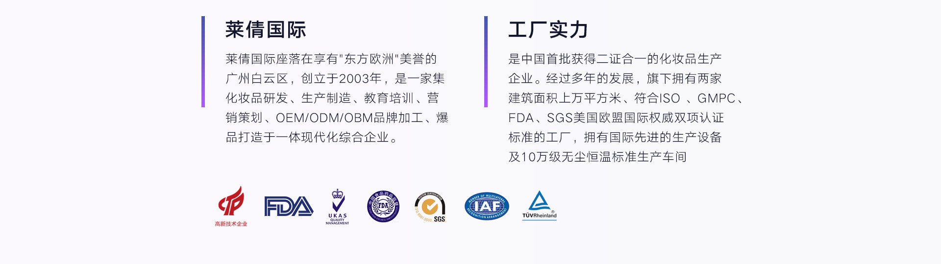 廣州萊倩化妝品有限公司座落在享有"東方歐洲"美譽(yù)的廣州白云區(qū),創(chuàng)立于2003年,是一家集化妝品研發(fā)、生產(chǎn)制造、教育培訓(xùn)、營(yíng)銷(xiāo)策劃、OEM/ODM/OBM品牌加工、爆品打造于一體現(xiàn)代化綜合企業(yè)。是中國(guó)首批獲得二證合一的化妝品生產(chǎn)企業(yè)經(jīng)過(guò)多年的發(fā)展,旗下?lián)碛袃杉医ㄖ娣e上萬(wàn)平方米、符合ISO 、GMPC、FDA、SGS美國(guó)歐盟國(guó)際權(quán)威雙項(xiàng)認(rèn)證標(biāo)準(zhǔn)的工廠,擁有國(guó)際先進(jìn)的生產(chǎn)設(shè)備及30萬(wàn)級(jí)無(wú)塵恒溫標(biāo)準(zhǔn)生產(chǎn)車(chē)間。日均產(chǎn)能120000支;全自動(dòng)壓粉生產(chǎn)線4條,粉類(lèi)產(chǎn)品日均產(chǎn)能50000盒;膏霜乳液?jiǎn)卧?條生產(chǎn)線,日均產(chǎn)能80000盒。