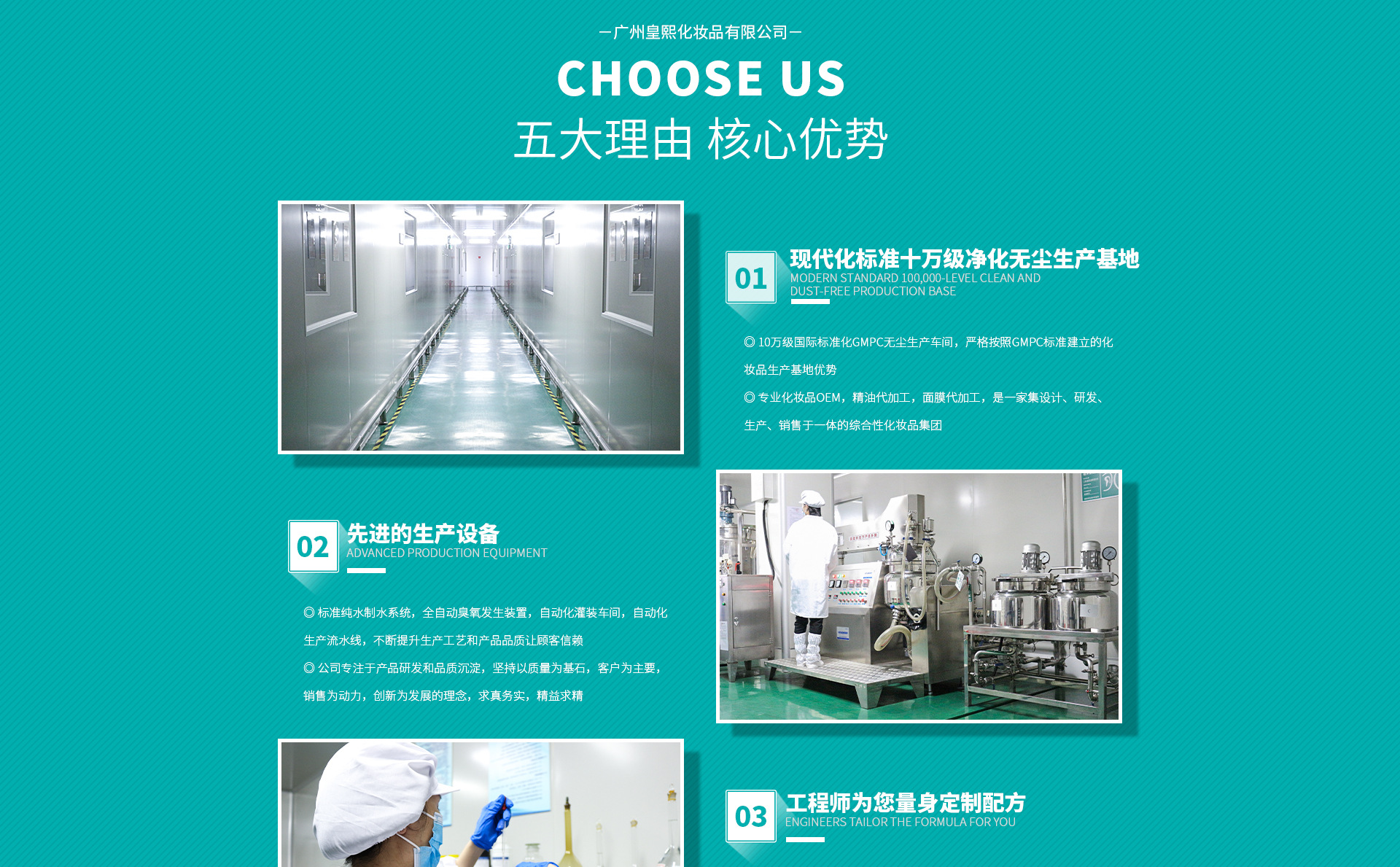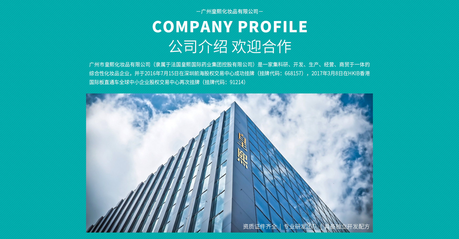 廣州市皇熙化妝品有限公司是一家集科研、開發(fā)、生產(chǎn)、銷售于一體的現(xiàn)代化綜合性化妝品集團(tuán)。專注于專業(yè)線、日化線OEM/ODM/OBM服務(wù),擁有專業(yè)的科研中心、生產(chǎn)中心、銷售中心和管理中心。公司以質(zhì)量為生命,建設(shè)擁有GMPC認(rèn)證和ISO9001質(zhì)量管理體系的10萬級凈化無塵生產(chǎn)車間和研發(fā)檢測中心,精選各地優(yōu)質(zhì)原料,采用超臨界萃取等前沿工藝和技術(shù),全自動包裝流水線,完善的質(zhì)量管理體系,保證優(yōu)質(zhì)的產(chǎn)品質(zhì)量和服務(wù)??杉庸どa(chǎn)單方精油、復(fù)方精油、優(yōu)質(zhì)基礎(chǔ)油、草本油、草本液、面膜、純露、基礎(chǔ)型護(hù)膚、功能型護(hù)膚等產(chǎn)品,根據(jù)客戶不同需求量身定制加工。 2016年7月15日,廣州市皇熙化妝品有限公司在深圳前海新四板成功掛牌,掛牌代碼:668157。2017年3月8日在香港獲批通過全球中小企業(yè)股權(quán)交易中心直通車掛牌,掛牌代碼:91214。迎來企業(yè)發(fā)展史上的里程碑。