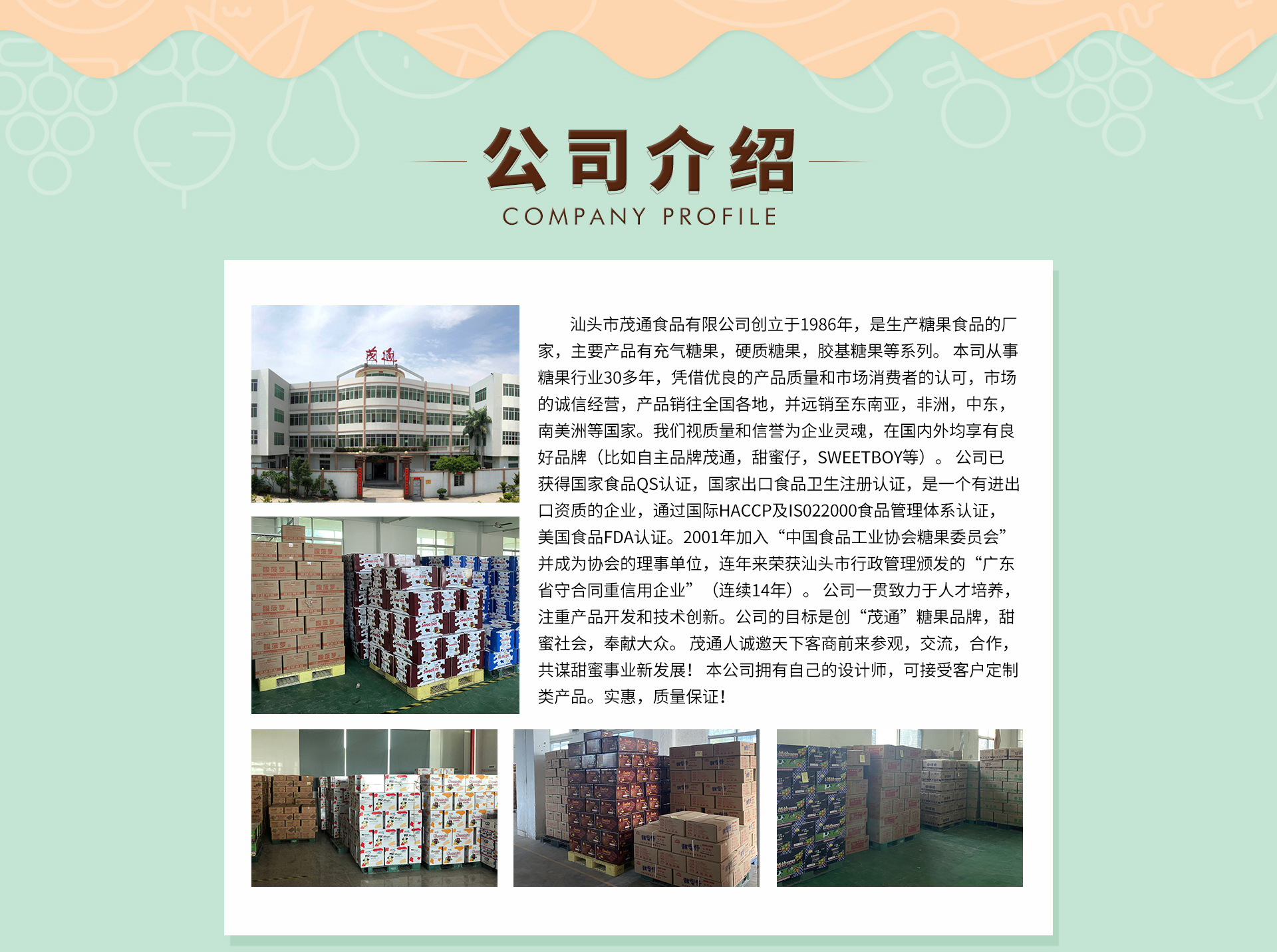 汕頭市茂通食品有限公司最初創(chuàng)立于1986年,是專業(yè)生產(chǎn)糖果食品 的廠家,擁有至今30多年來的經(jīng)驗,主要產(chǎn)品有充氣糖果,硬質(zhì)糖果, 膠基糖果等系列。 憑借優(yōu)良的產(chǎn)品質(zhì)量和市場消費(fèi)者的認(rèn)可,市場的誠信經(jīng)營, 產(chǎn)品銷往全國各地,并遠(yuǎn)銷至東南亞,非洲,中東,南美洲等國家。 我們視質(zhì)量和信譽(yù)為企業(yè)靈魂,在國內(nèi)外均享有良好品牌。 公司已獲得國家食品安全QS認(rèn)證,國家出口食品衛(wèi)生注冊認(rèn)證, 是一個有進(jìn)出口資質(zhì)的企業(yè),通過國際HACCP及IS022000食品安全 管理體系認(rèn)證,美國食品FDA認(rèn)證。2001年加入“中國食品工業(yè)協(xié) 會糖果專業(yè)委員會”并成為協(xié)會的理事單位,連續(xù)15年來榮獲汕頭市 工商行政管理頒發(fā)的“廣東省守合同重信用企業(yè)”。 公司一貫致力于人才培養(yǎng),注重產(chǎn)品開發(fā)和技術(shù)創(chuàng)新。 公司的目標(biāo)是創(chuàng)“茂通”優(yōu)質(zhì)糖果品牌,甜蜜社會,奉獻(xiàn)大眾。 茂通人誠邀天下客商前來參觀,交流,合作,共謀甜蜜事業(yè)新