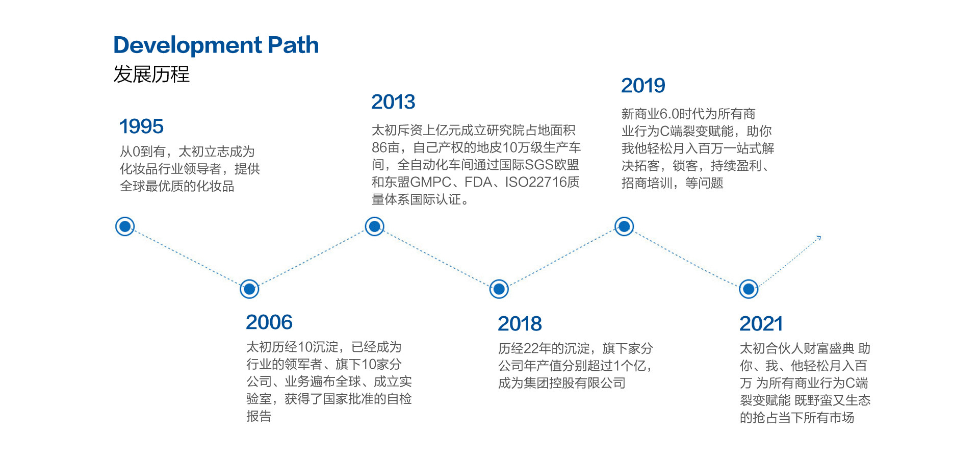 珠海市東部太初化妝品有眼公司成立于1996年,是一家專業(yè)從事化妝品的科研、開(kāi)發(fā)、生產(chǎn)、營(yíng)銷服務(wù)、文化教育 為一體化的國(guó)家高新技術(shù)企業(yè)。目前擁有20000多平方米的科技園,是領(lǐng)先的技術(shù)創(chuàng)新驅(qū)動(dòng)型化妝品企業(yè),在化妝 品行業(yè)擁有重要影響力。公司廠部座落于美麗的南中國(guó)海濱城市珠海著名的生物醫(yī)藥專區(qū),廠區(qū)綠草茵茵,環(huán)境優(yōu) 美,擁有國(guó)內(nèi)一流的生產(chǎn)設(shè)備以及一批具有高學(xué)位和高級(jí)職稱的科研技術(shù)人才,創(chuàng)新核心JDM —體化參與性品牌 深度戰(zhàn)略合伙人模式(聯(lián)合設(shè)計(jì)制造)更是打破了護(hù)膚代工行業(yè)的壁壘,更好、更緊密、更貼近市場(chǎng)與客戶所需注 重技術(shù)研發(fā)和創(chuàng)意團(tuán)隊(duì)建設(shè),致力于全球資源整合,如合作品牌、專業(yè)研發(fā)機(jī)梅、優(yōu)秀的策劃設(shè)計(jì)團(tuán)隊(duì)。集團(tuán)旗下 有3家子公司、享譽(yù)國(guó)際一韓國(guó)蘭芝(丹迪蘭)品牌:野蠻生態(tài)聚商系統(tǒng)就是由馨鮮生物科技有限公司主要負(fù)責(zé)運(yùn)營(yíng), 通過(guò)三大平臺(tái);四大臺(tái)階;6個(gè)聚商圈;讓整個(gè)美容行業(yè)回歸行業(yè)初心。