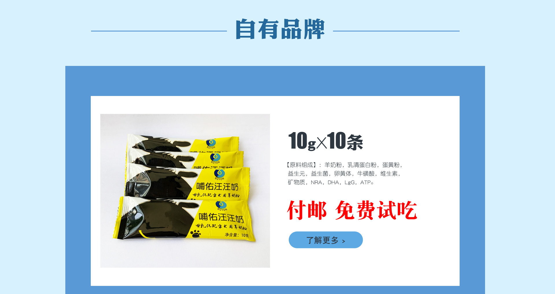 河南哺佑寵物食品有限公司,是生產(chǎn)銷售寵物食品的專業(yè)化公司。公司前身是商丘德力銀寵物食品有限公司。2012年在河南商丘成立,生產(chǎn)地址坐落于美麗的壩清河畔,現(xiàn)有員工總計(jì)60人。公司注冊商標(biāo)是哺佑。公司現(xiàn)在有四大類共60多個(gè)產(chǎn)品。 一,寵物狗類:寵物羊奶粉,幼犬羊奶粉,泰迪專用羊奶粉,孕期奶粉,老年犬營養(yǎng)粉,蛋白粉,美毛粉,奶片,鈣片,鈣粉 ,奇力素,腸安,海藻粉,豐滿多等。 寵物貓類:貓咪奶粉,奶片,鈣片,鈣粉,海藻粉 二,鳥類營養(yǎng)品:鸚鵡奶粉,高脂鸚鵡奶粉,鸚鵡高鈣奶粉,艷毛粉。 三,兔子,倉鼠奶粉。兔兔奶 四,特養(yǎng)動(dòng)物奶粉:狐貉貂奶粉,高蛋白粉 五,反芻動(dòng)物奶粉:羔羊奶粉,梅花鹿奶粉,羊初乳 六,其他奶粉,家禽開口寶,強(qiáng)化劑. 為滿足寵物寶寶在離乳期(奶糕期)對奶粉的持續(xù)需求,并根據(jù)寵物寶寶的生理及心理,吸收與營養(yǎng)要求,本公司又推出新產(chǎn)品哺佑羊奶糧。以羊奶粉為主要原料