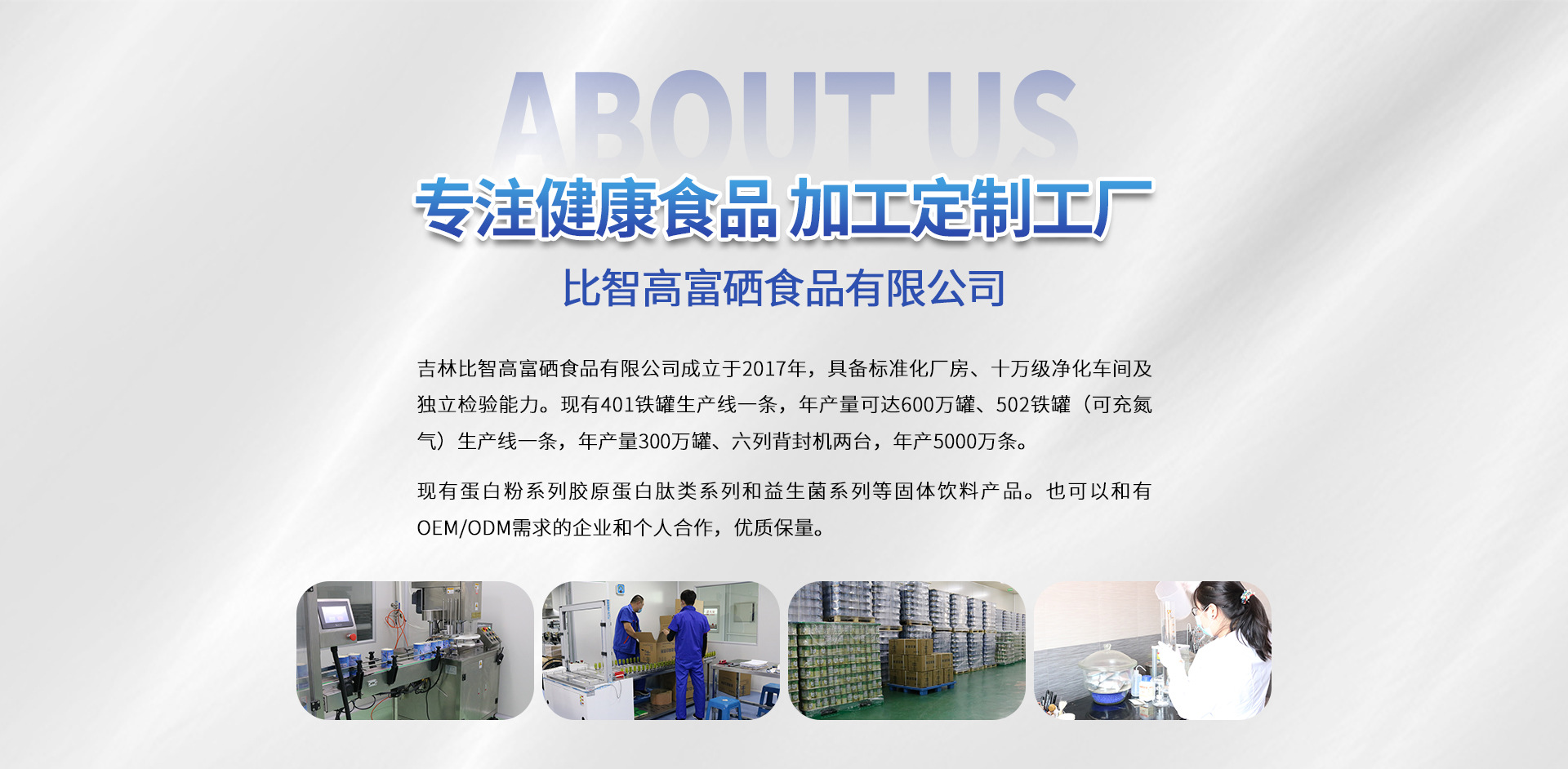 吉林比智高富硒食品有限公司成立于2017年,具備標準化廠房、十萬級凈化車間及獨立檢驗?zāi)芰Α,F(xiàn)有401鐵罐生產(chǎn)線一條,年產(chǎn)量可達600萬罐、502鐵罐(可充氮氣)生產(chǎn)線一條,年產(chǎn)量300萬罐、六列背封機兩臺,年產(chǎn)5000萬條?,F(xiàn)有蛋白粉系列、膠原蛋白肽類系列和益生菌系列等固體飲料產(chǎn)品。也可以和有OEM需求的企業(yè)和個人合作,。優(yōu)質(zhì)保量,發(fā)貨及時