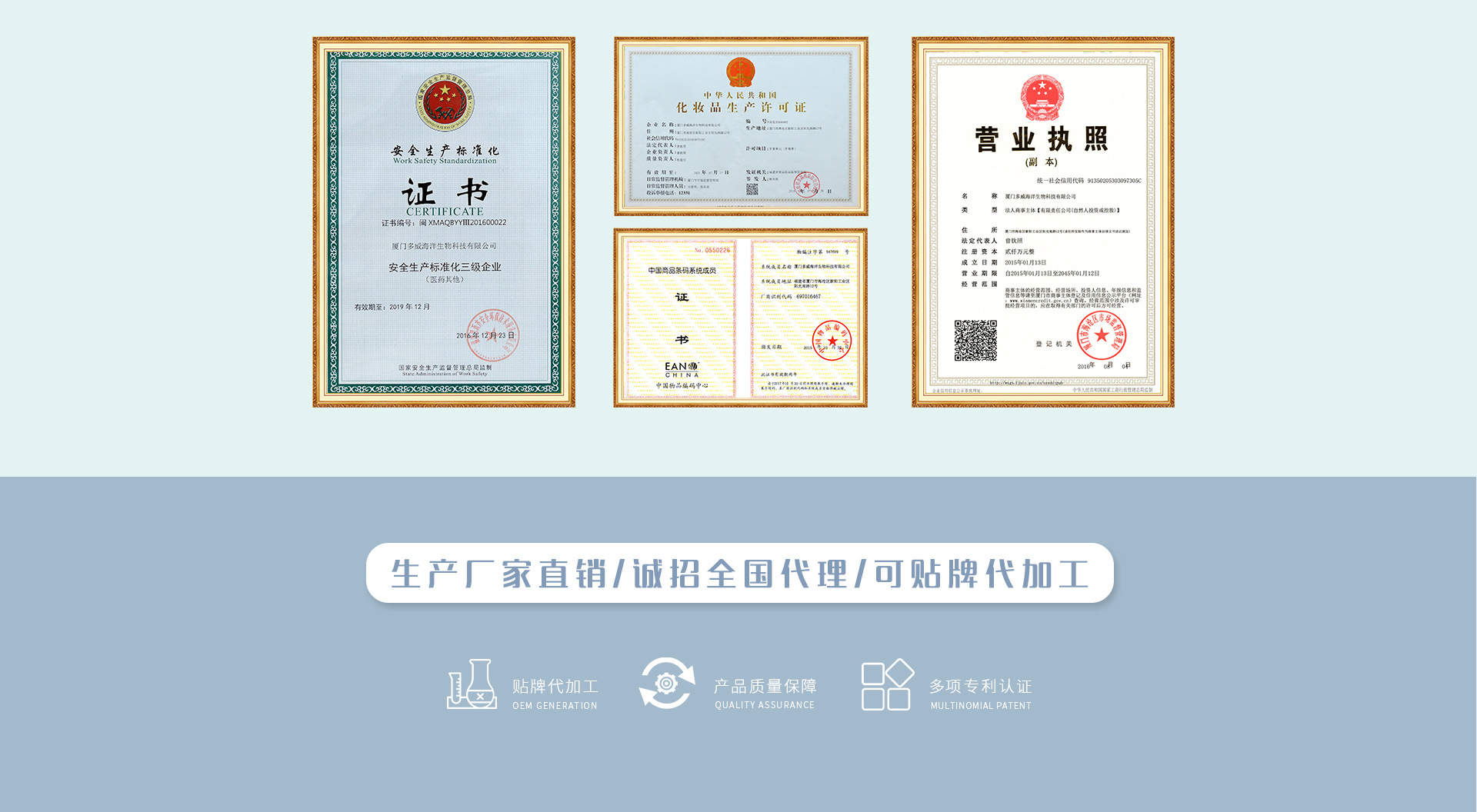 廈門多威海洋生物科技有限公司 由廈門市政府所屬海滄投資公司與臺資企業(yè)集團(tuán) 合資組成(屬政府與外資企業(yè)合資,實(shí)力雄厚) 創(chuàng) 立:2015年1月 同年底取得衛(wèi)生許可證 注冊資本:RMB 2000萬經(jīng)營范圍:生物科技推廣服務(wù),肥皂及合成洗滌劑制造;口腔清潔用品及其他日化品制造,化妝品及衛(wèi)生用品制造銷售等。 公司概況:企業(yè)占地面積26325平方米,建筑面積16255平方米。 一期生產(chǎn)車間及倉庫面積為7200平方米,公司一期生產(chǎn)線主要生產(chǎn)牙膏類化妝品,目前產(chǎn)能為4200噸 /年,車間設(shè)計(jì)產(chǎn)能為16800噸/年。 在2016年7月底取得新版的《化妝品生產(chǎn)許可證》,是廈門首家取得新證的化妝品生產(chǎn)企業(yè)。被廈門市場監(jiān)督管理局作為廈門的樣版企業(yè)。 備注:目前國內(nèi)對于牙膏生產(chǎn)證照從嚴(yán)審核,多威海洋是2011年以來全國極少數(shù)被核準(zhǔn)的牙膏生產(chǎn)工廠之一。