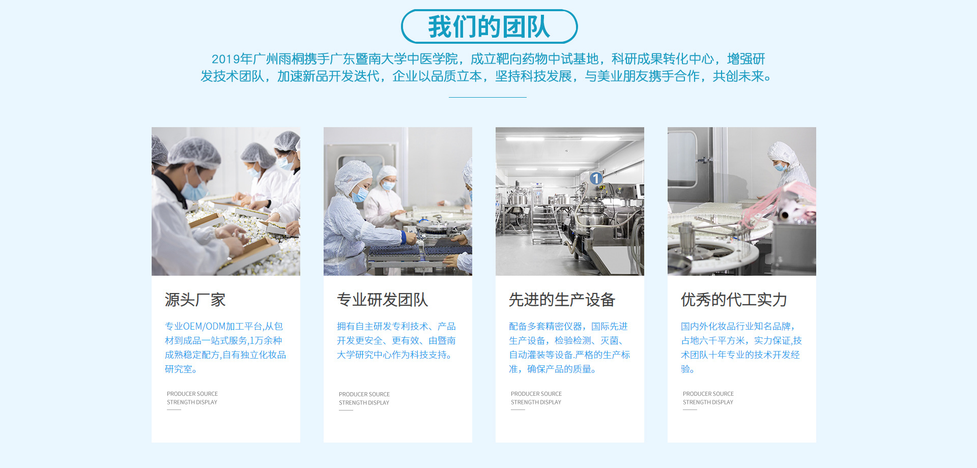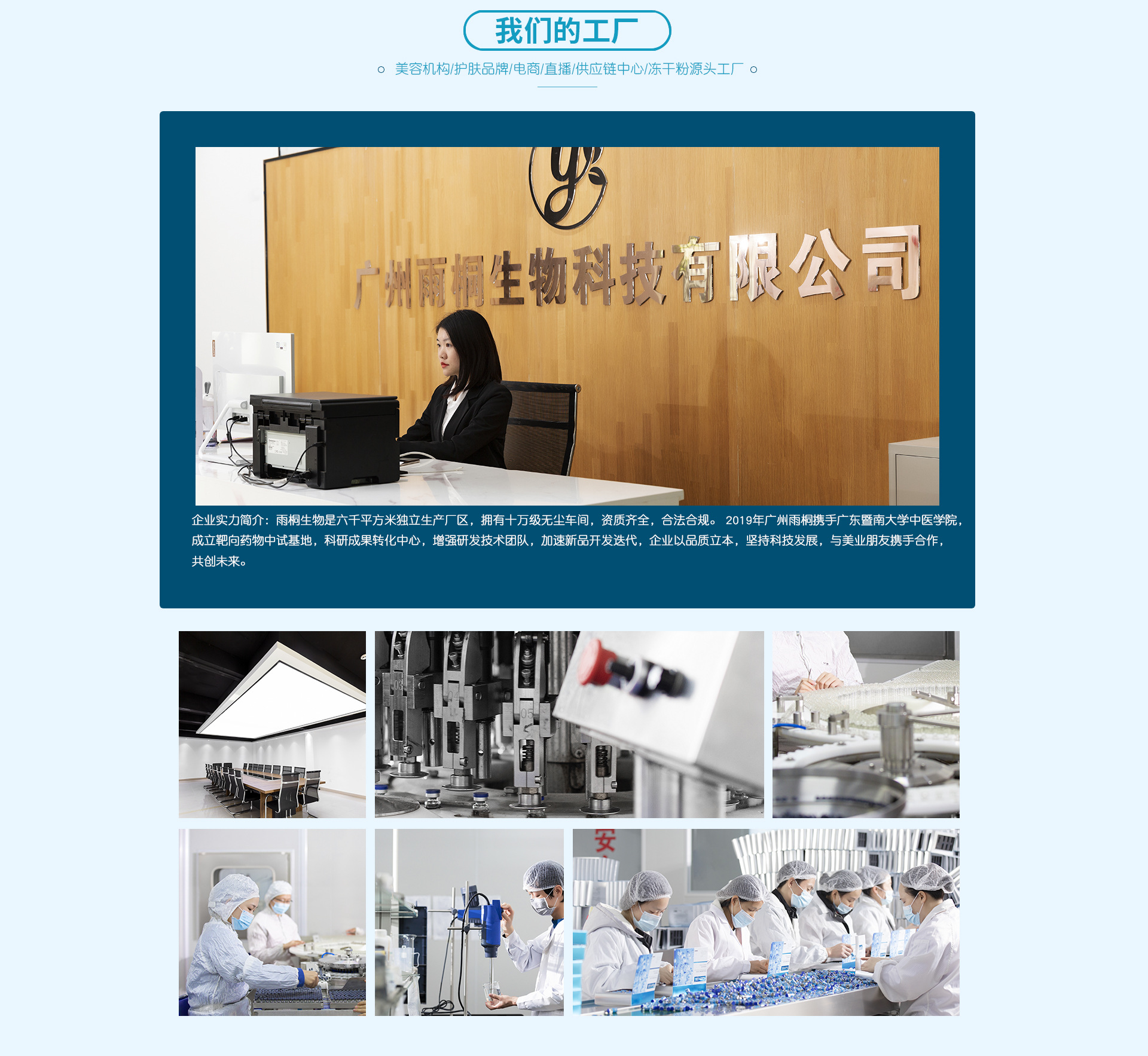 廣州雨桐生物科技有限公司是一家集科技研發(fā)、生產(chǎn)加工、產(chǎn)品定制、品牌服務(wù)的化妝品源頭廠家。主要生產(chǎn)修復(fù)凍干粉、功效型凍干粉、面膜、精華原液,水乳膏霜等產(chǎn)品。長期供應(yīng)產(chǎn)品,服務(wù)于大型護(hù)膚品廠家OEM、凍干粉品牌方ODM、頭部主播帶貨訂單、網(wǎng)購化妝品加工等。雨桐生物是六千平方米獨(dú)立生產(chǎn)廠區(qū),擁有十萬級無塵車間,資質(zhì)齊全,合法合規(guī)。 2019年廣州雨桐攜手廣東暨南大學(xué)中醫(yī)學(xué)院,成立靶向藥物中試基地,科研成果轉(zhuǎn)化中心,增強(qiáng)研發(fā)技術(shù)團(tuán)隊(duì),加速新品開發(fā)迭代,企業(yè)以品質(zhì)立本,堅(jiān)持科技發(fā)展,與美業(yè)朋友攜手合作,共創(chuàng)未來。
