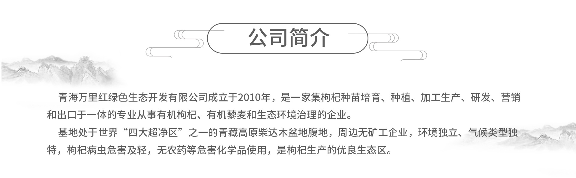 青海萬里紅綠色生態(tài)開發(fā)有限公司成立于2010年,注冊資金人民幣8200萬元,累計投資2.2億元。公司針對青藏高原的地域特產(chǎn),開展全產(chǎn)業(yè)鏈經(jīng)營,旨在打造高原綠色生態(tài)產(chǎn)業(yè)平臺。主營業(yè)務包括: 高原有機農(nóng)業(yè)——有機農(nóng)場3.3萬畝(位于柴達木盆地東南部海西州都蘭縣香日德鎮(zhèn)小夏灘地區(qū)原戈壁荒漠)。種植有機枸杞8000畝(其中黑枸杞1500畝),有機藜麥1500畝,有機青粿6000畝及中草藥等有少量種植。 原生態(tài)牧業(yè)——生態(tài)循環(huán)牧場3000畝,另外聯(lián)合本地12家傳統(tǒng)牧場,牦牛、藏羊、藏香豬等高原肉畜年出欄超10000頭。在傳統(tǒng)牧業(yè)基礎上,現(xiàn)已開展畜只認養(yǎng)業(yè)務。 農(nóng)產(chǎn)品加工業(yè)——枸杞、藜麥、青粿作物的全套加工能力。日鮮果烘干能力達60噸,日加工藜麥20噸。 公司宗旨:改造沙漠,帶動周邊農(nóng)戶發(fā)展,為客戶提供原生態(tài)食材。
