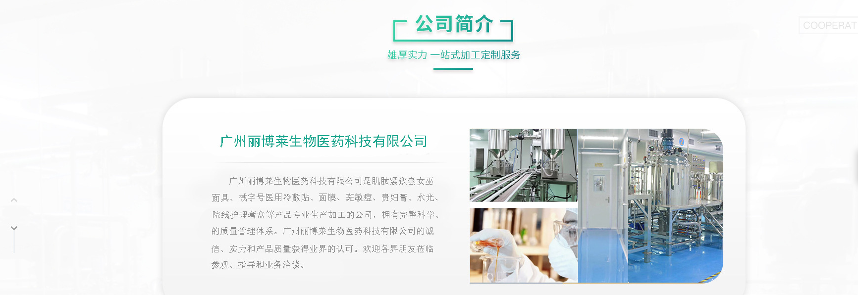 廣州麗博萊生物醫(yī)藥科技有限公司是肌肽緊致套女巫面具、械宇號醫(yī)用冷敷貼、面膜、斑敏痘、費婦膏、水光、院線護理套盒等產(chǎn)品專業(yè)生產(chǎn)加工的公司,擁有完整科學、的質(zhì)量管理體系。廣州麗博萊生物醫(yī)藥科技有限公司的誠信、文力和產(chǎn)品質(zhì)量獲得業(yè)界的認可。歡迎各界朋友蒞臨參觀、指導和業(yè)務洽談。