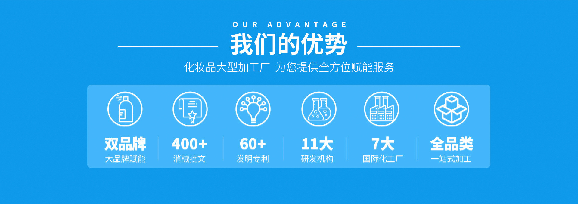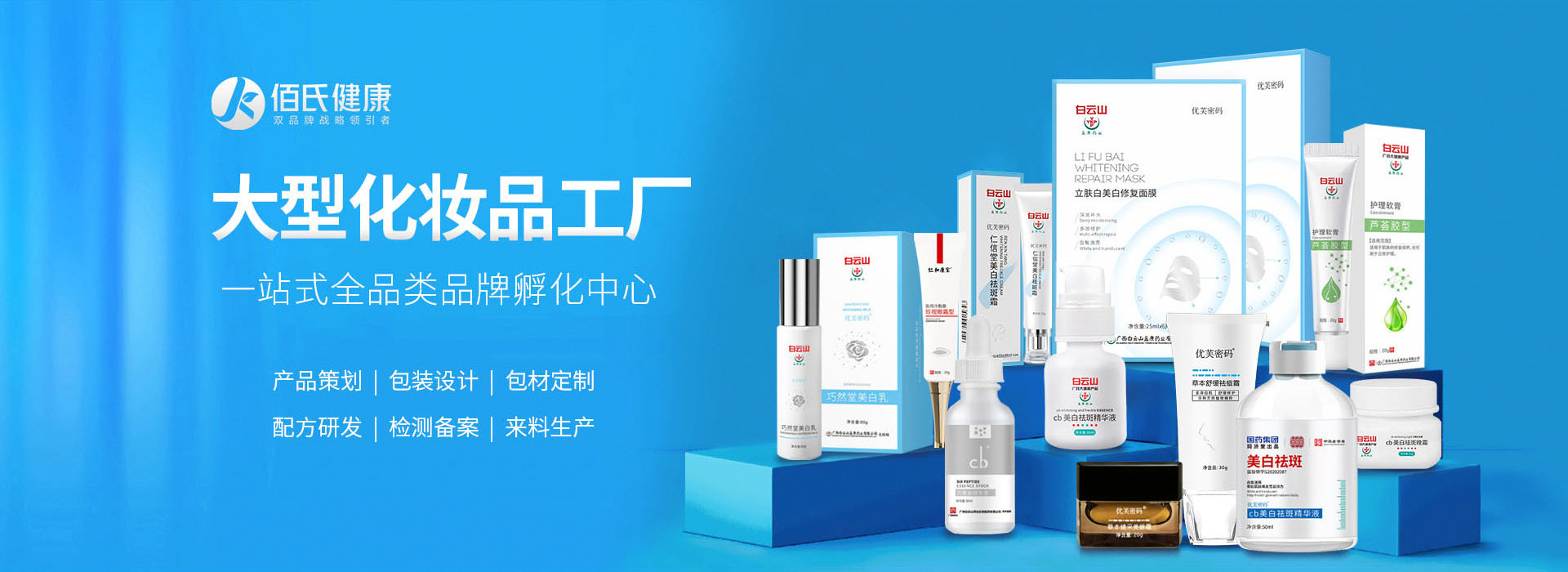 中國(guó)廣州佰氏醫(yī)療股份有限公司總部位于廣州,創(chuàng)建于2009年, 生產(chǎn)及研發(fā)涵蓋大健康和化妝品領(lǐng)域的全品類產(chǎn)品,以珠海中科先進(jìn)院和強(qiáng)大資源以及研發(fā)科研能力和優(yōu)勢(shì),打造大健康產(chǎn)業(yè)OEM/ODM新標(biāo)桿。 集團(tuán)在廣州、佛山、鄭州、成都、山西、寧夏擁有六大生產(chǎn)基地,十萬級(jí)的制藥標(biāo)準(zhǔn)無菌凈化車間,有德國(guó)、美國(guó)、意大利等先進(jìn)的自動(dòng)生產(chǎn)設(shè)備及儀器,實(shí)現(xiàn)整個(gè)生產(chǎn)流程的自動(dòng)化、精準(zhǔn)化、智能化。 主營(yíng)產(chǎn)品覆蓋全品類:潔面、水乳霜、精華、眼霜、彩妝等化妝品;冷敷貼、液體輔料、冷敷凝膠等一類、二類醫(yī)療器械;婦科凝膠、女性私密、延時(shí)噴劑、各種膠囊、各種疼痛貼、各種養(yǎng)生食品等等大健康產(chǎn)品。 工廠已通過GMPC和ISO雙重國(guó)際認(rèn)證,以及CE、FDA、MSDS等進(jìn)出口資質(zhì)認(rèn)證,為眾品牌提供高效、獨(dú)特、尖端的國(guó)際化環(huán)保系列產(chǎn)品和多元化、高品質(zhì)、新功效產(chǎn)品,打造健康生態(tài)一站式全案服務(wù)平臺(tái)。 佰氏健康集團(tuán)以“雙品牌戰(zhàn)略、借船出?!鄙虡I(yè)模式為指引,全維度SWOT分析串聯(lián)大品牌賦能及背書,結(jié)合精準(zhǔn)的品牌全案策劃,從品牌、團(tuán)隊(duì)、營(yíng)銷引爆勢(shì)能,從0到1到100,幫客戶達(dá)成億級(jí)企業(yè)夢(mèng)想。