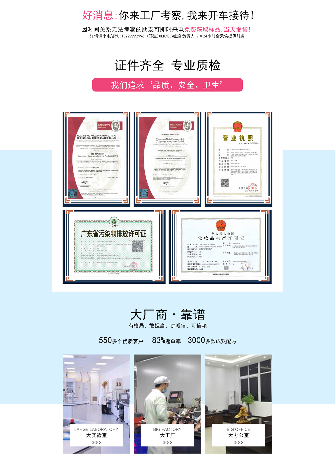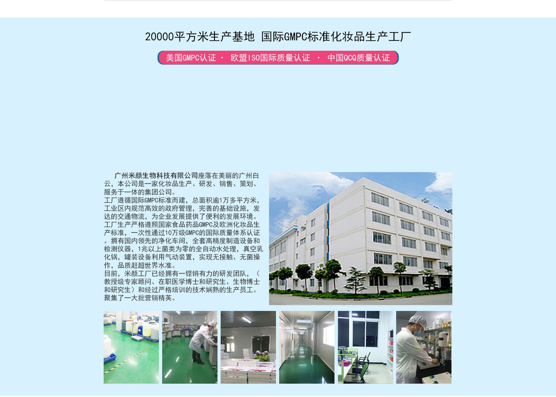 工廠生產(chǎn)嚴(yán)格遵照國(guó)家食品藥品GMPC及歐洲化妝品生產(chǎn)標(biāo)準(zhǔn),一次性通過10萬級(jí)GMPC的國(guó)際質(zhì)量體系認(rèn)證。擁有國(guó)內(nèi)領(lǐng)先的凈化車間,全套高精度制造設(shè)備和檢測(cè)儀器,1兆以上菌類為零